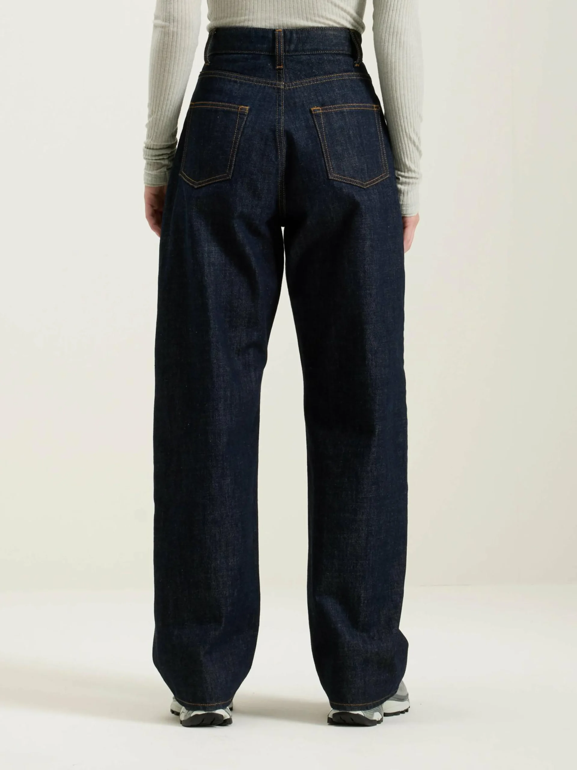 Super hoog getailleerde 5-pocket jeans met wijde pijpen, van rinse katoendenim.
