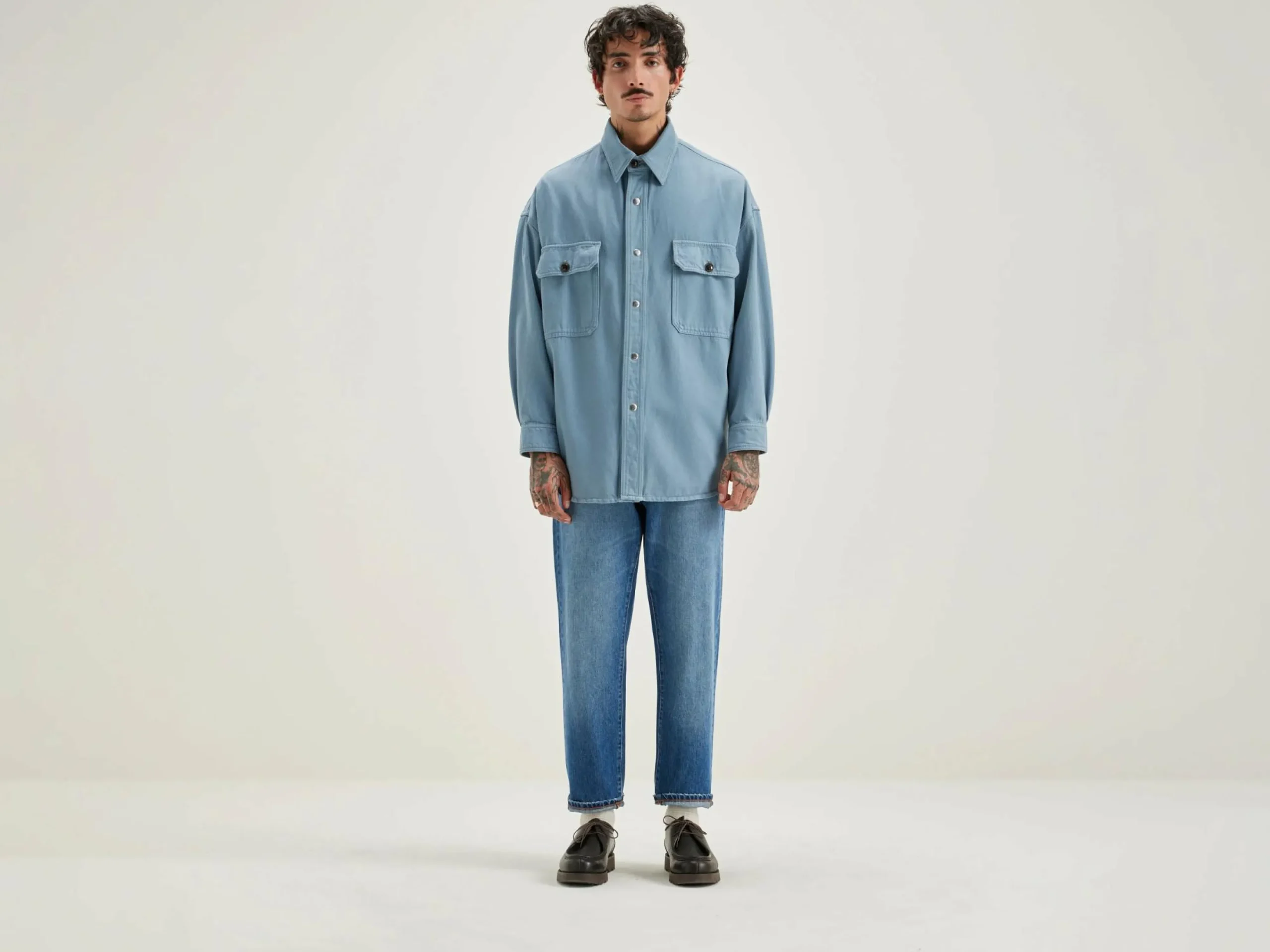 Oversized overshirt met opgestikte zak, van Chambray-blauw katoen.