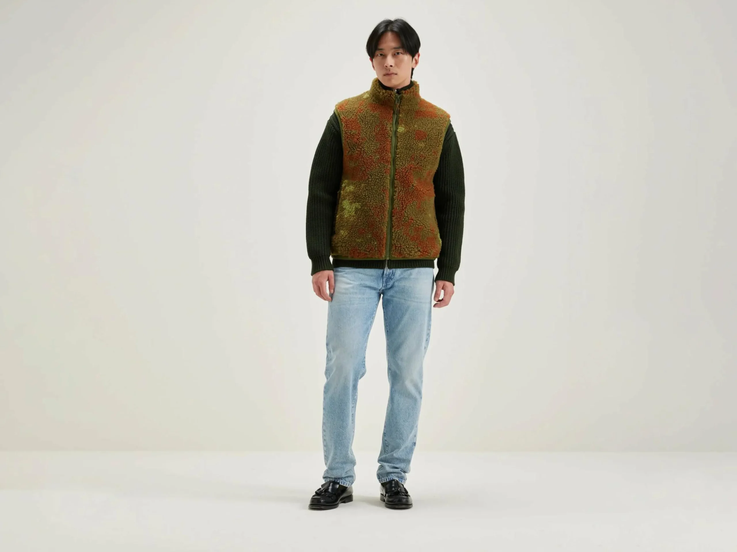 Mouwloos sweatshirt bodywarmer met rechte pasvorm en ritssluiting vooraan, in teddy met camouflageprint.
