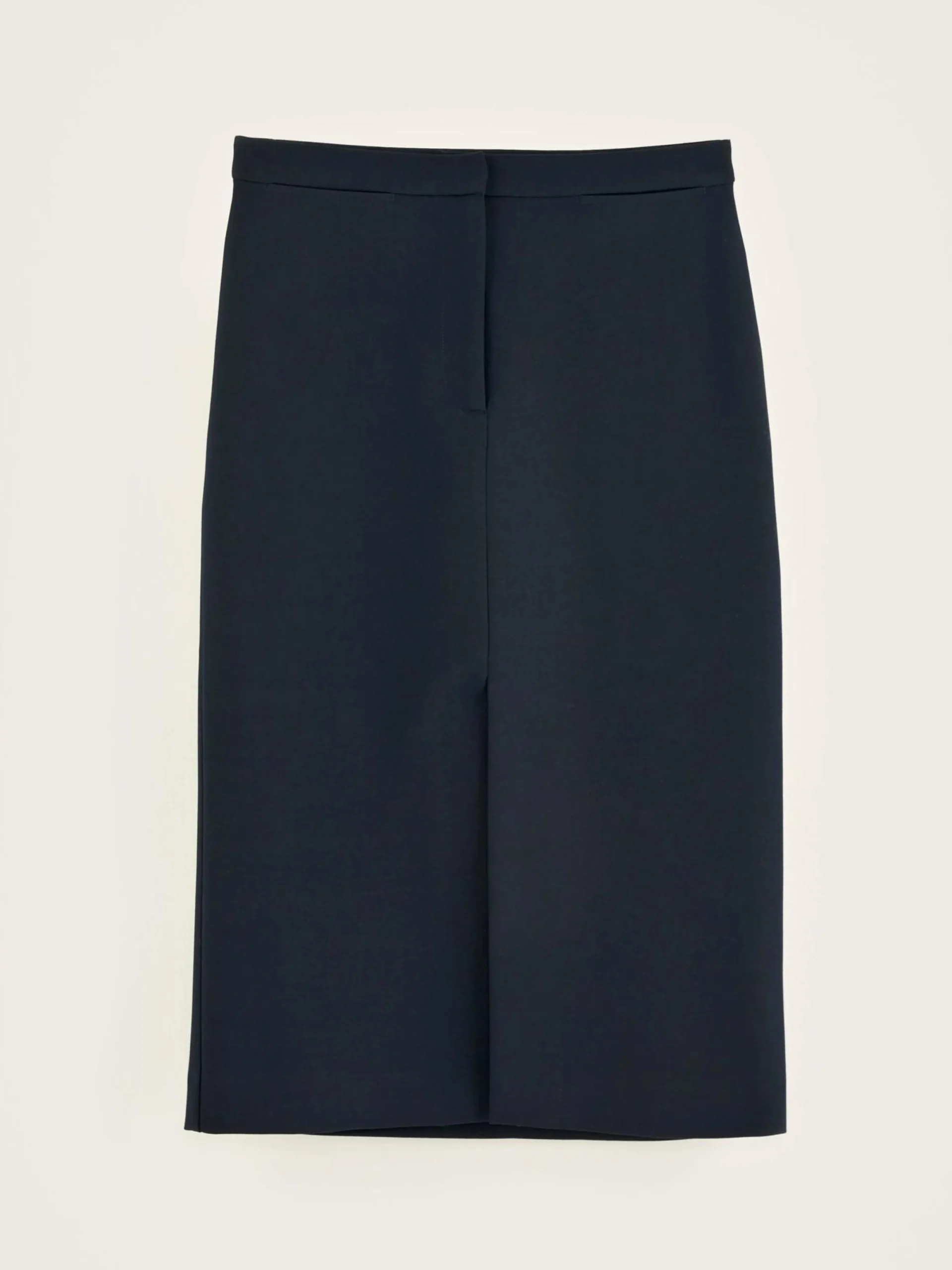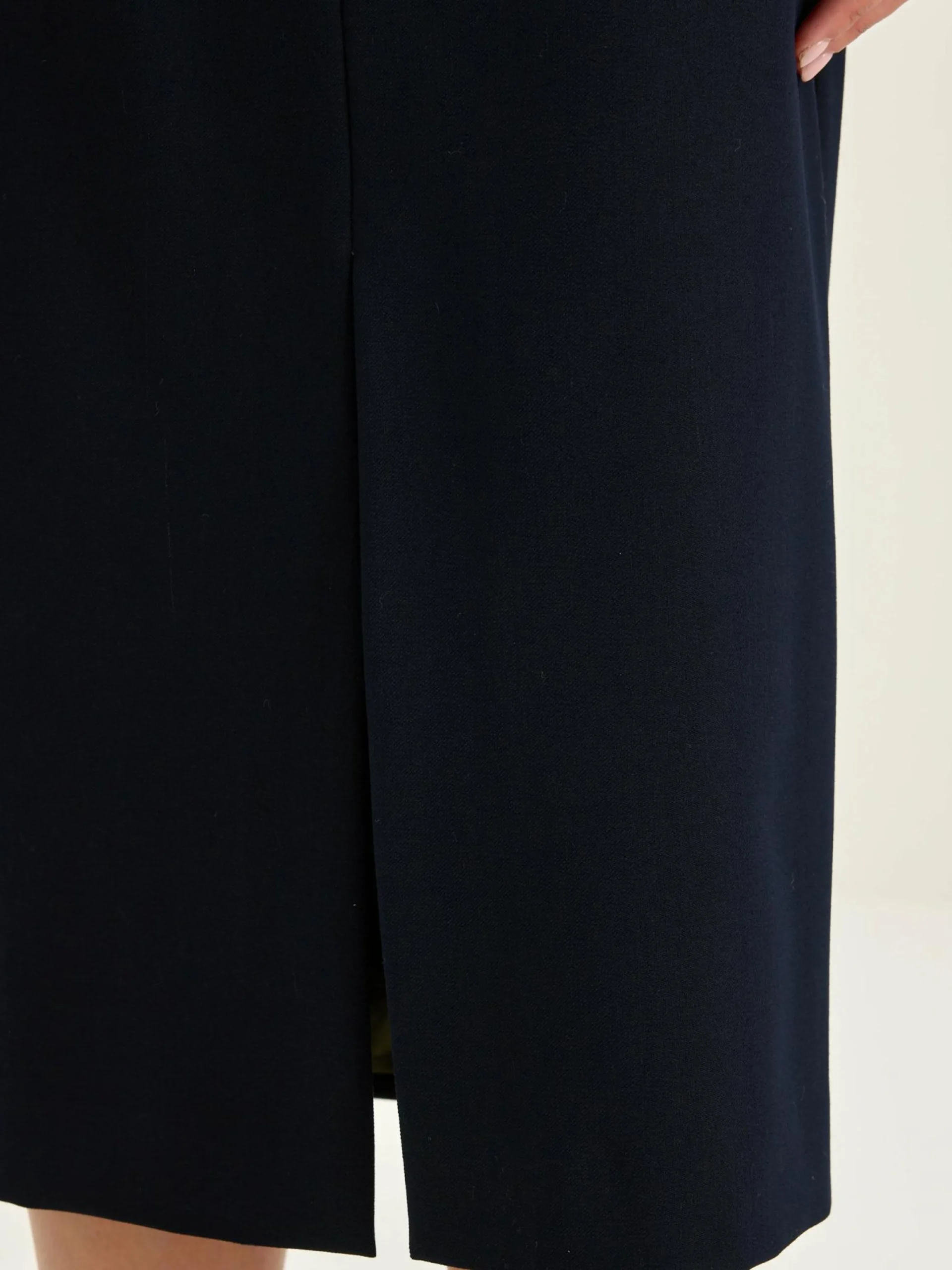 Marineblauwe high-waist kokerrok met voorsplit en discrete zakken.