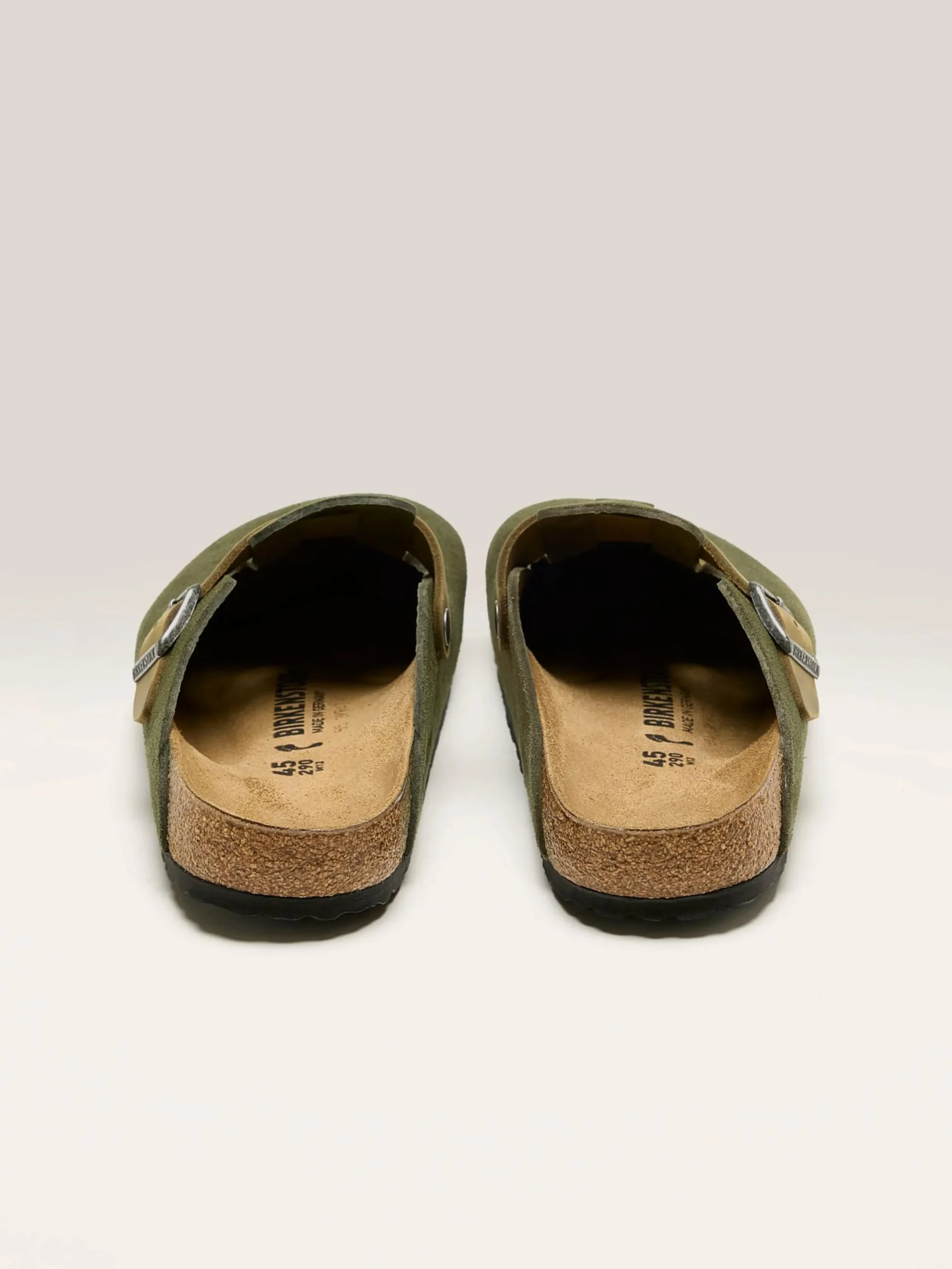 De Birkenstock Boston Gemengd Leder klompen hebben een zacht suède bovenwerk met een geolied lederen verstelbaar riempje en een kurken voetbed gevoerd met suède.