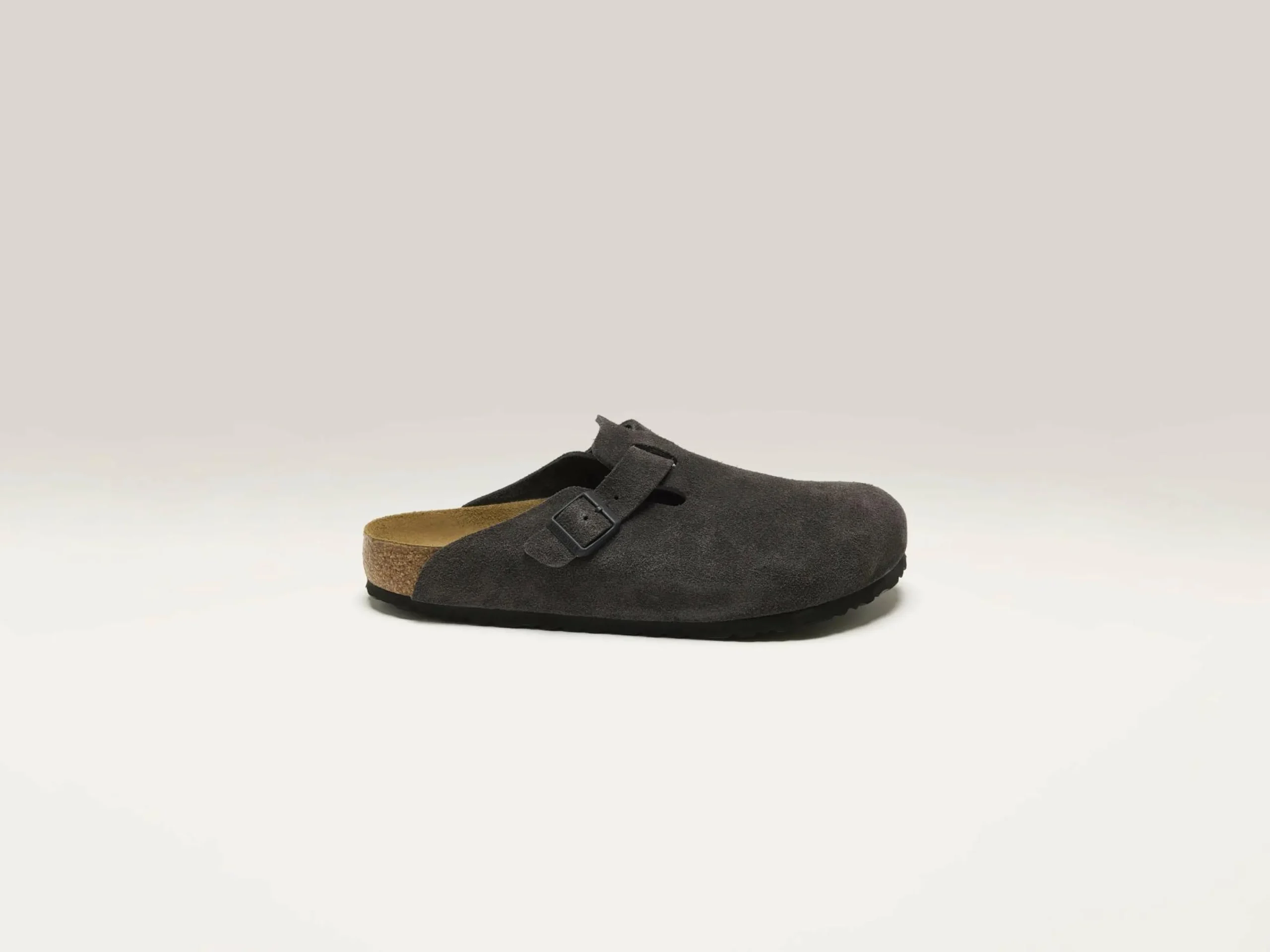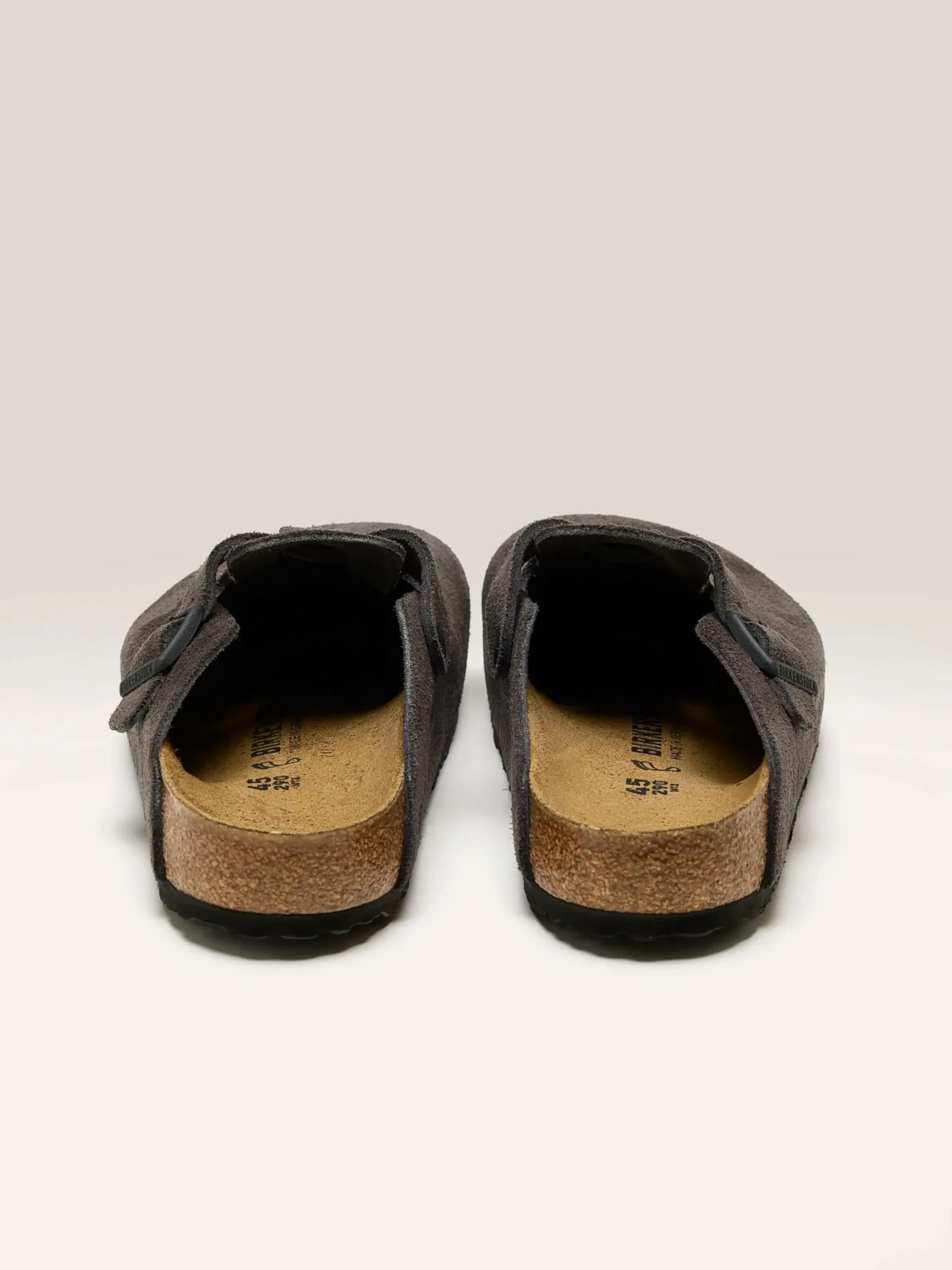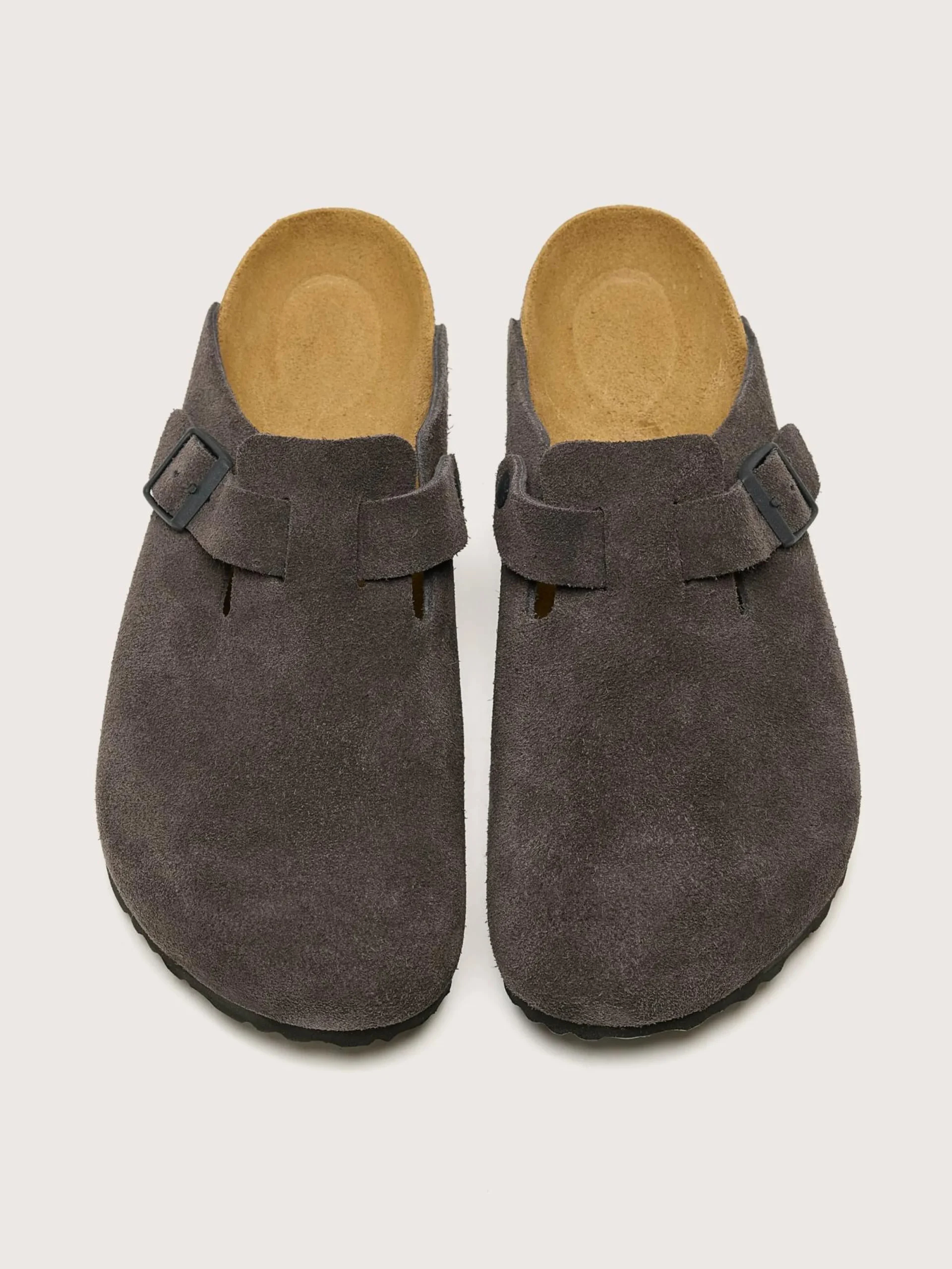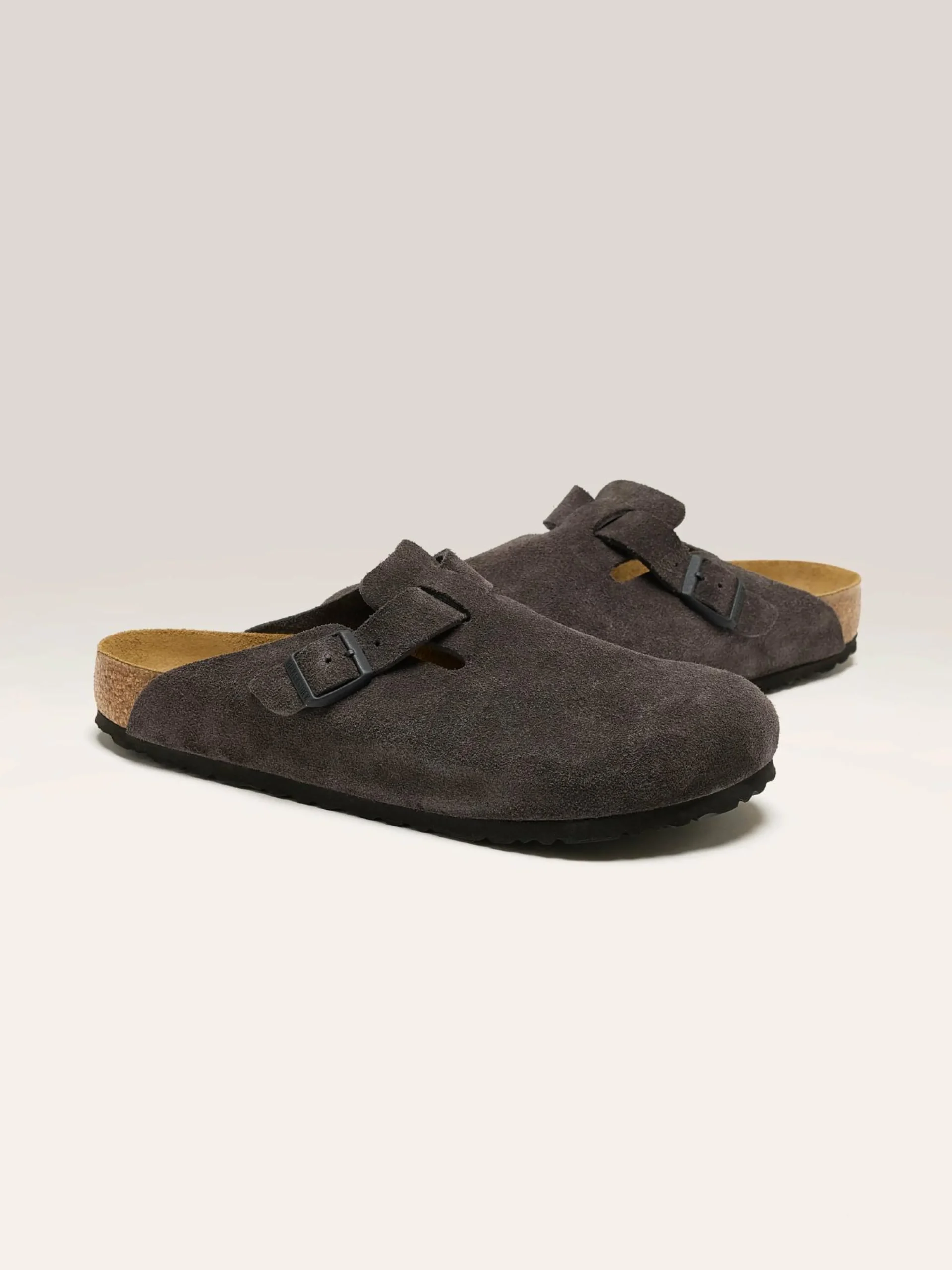 De Birkenstock Boston klompen hebben een lichtgewicht, flexibele EVA-zool, een anatomisch gevormd kurk-latex voetbed en een bovenwerk van splitleder en suède met een wax-finish.