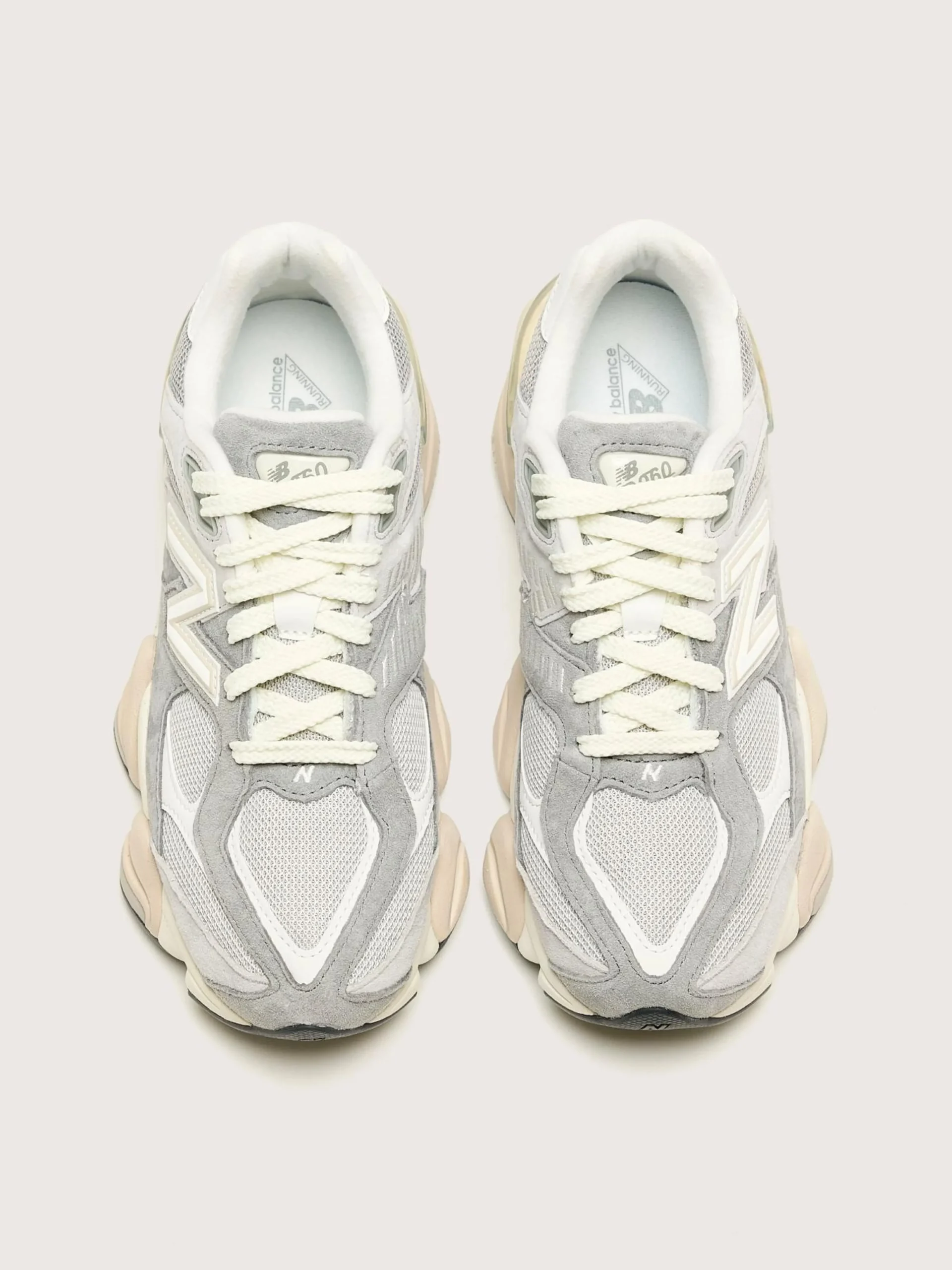 De New Balance 9060 sneakers hebben een technisch bovenwerk van leder, suède en mesh, een dempende middenzool en een buitenzool met een diamanten patroon.
