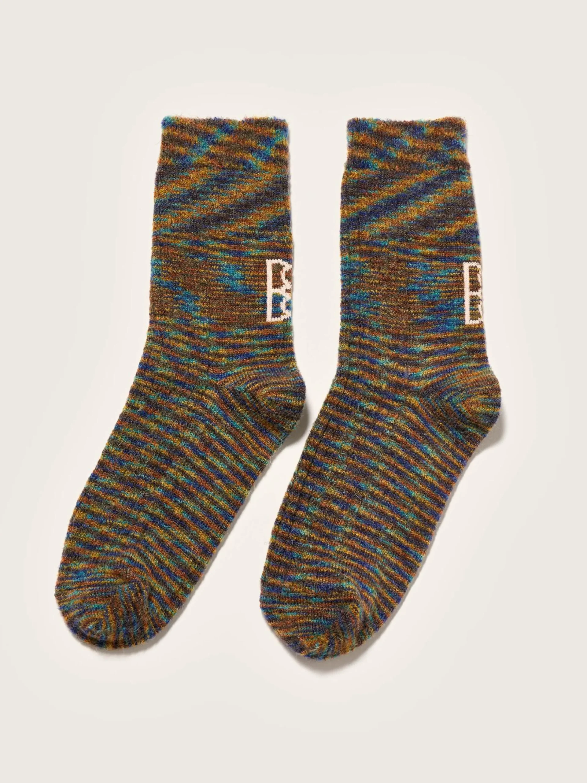 Klassieke sokken van meerkleurig garen, met contrasterend roze Bellerose-logo op de hielen.