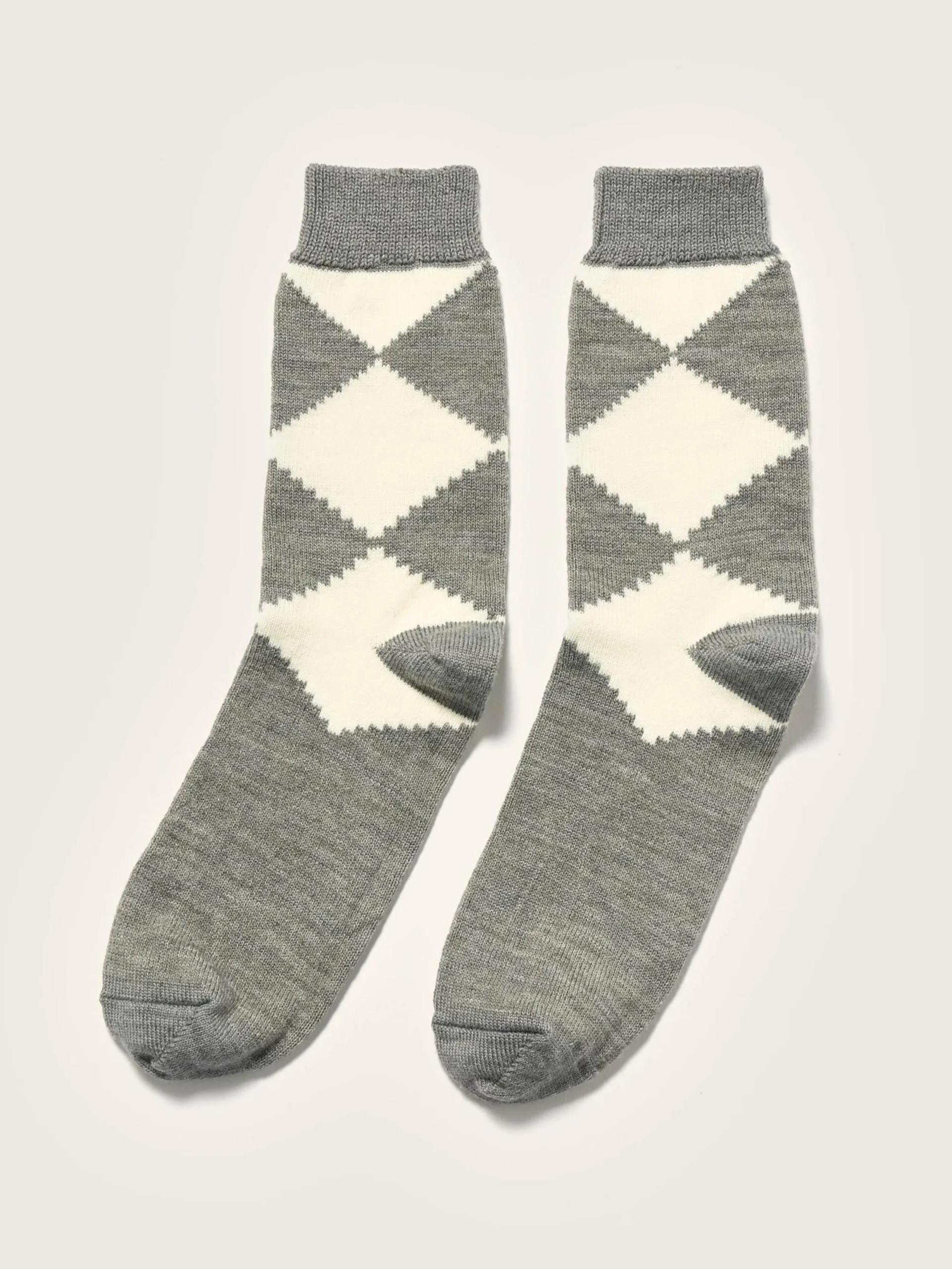 Klassieke, heidegrijze sokken met een diamantpatroon.