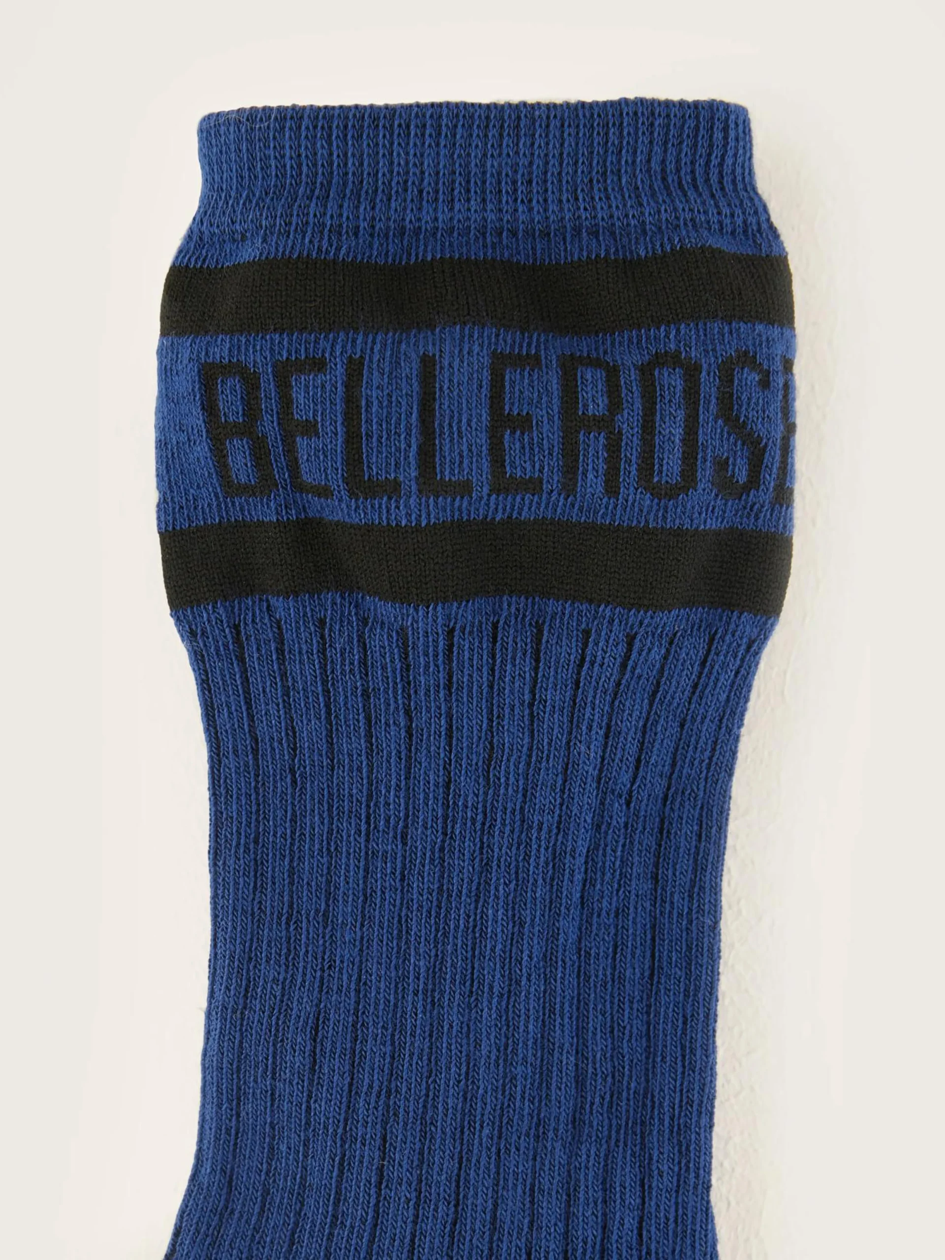 Klassieke sokken in blauw met het Bellerose-logo in zwart op de enkel.