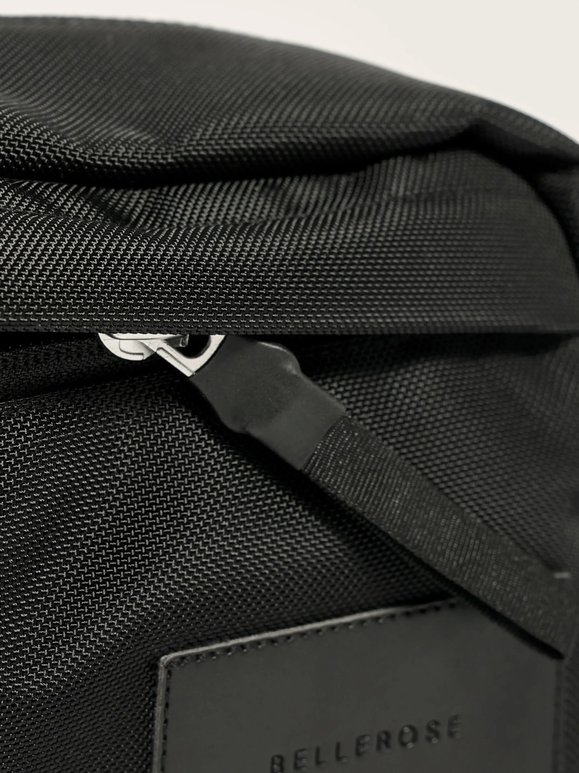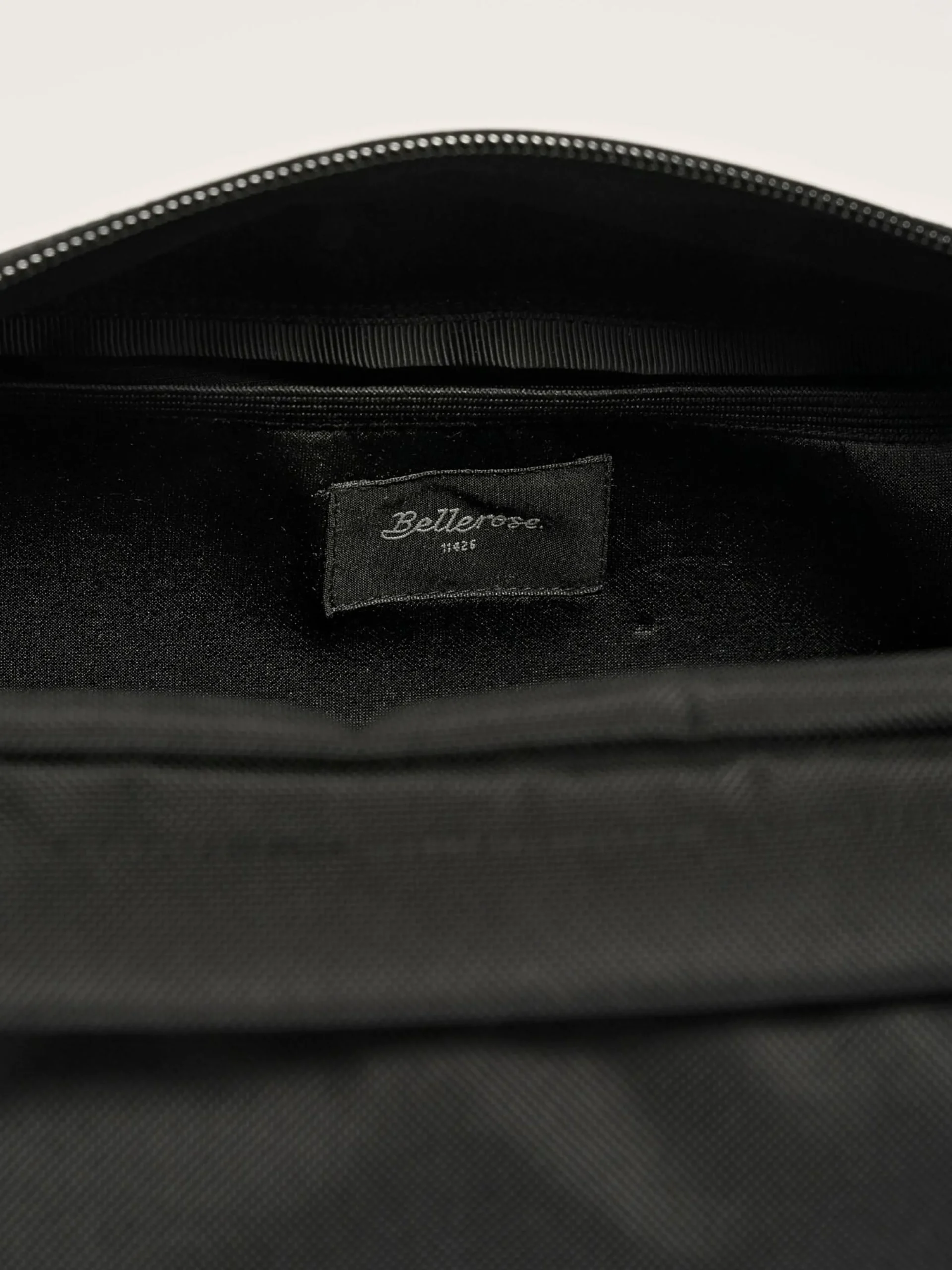 Toilettas van zwart gecoat nylon, met ritssluiting bovenaan en karabijnhaak.
