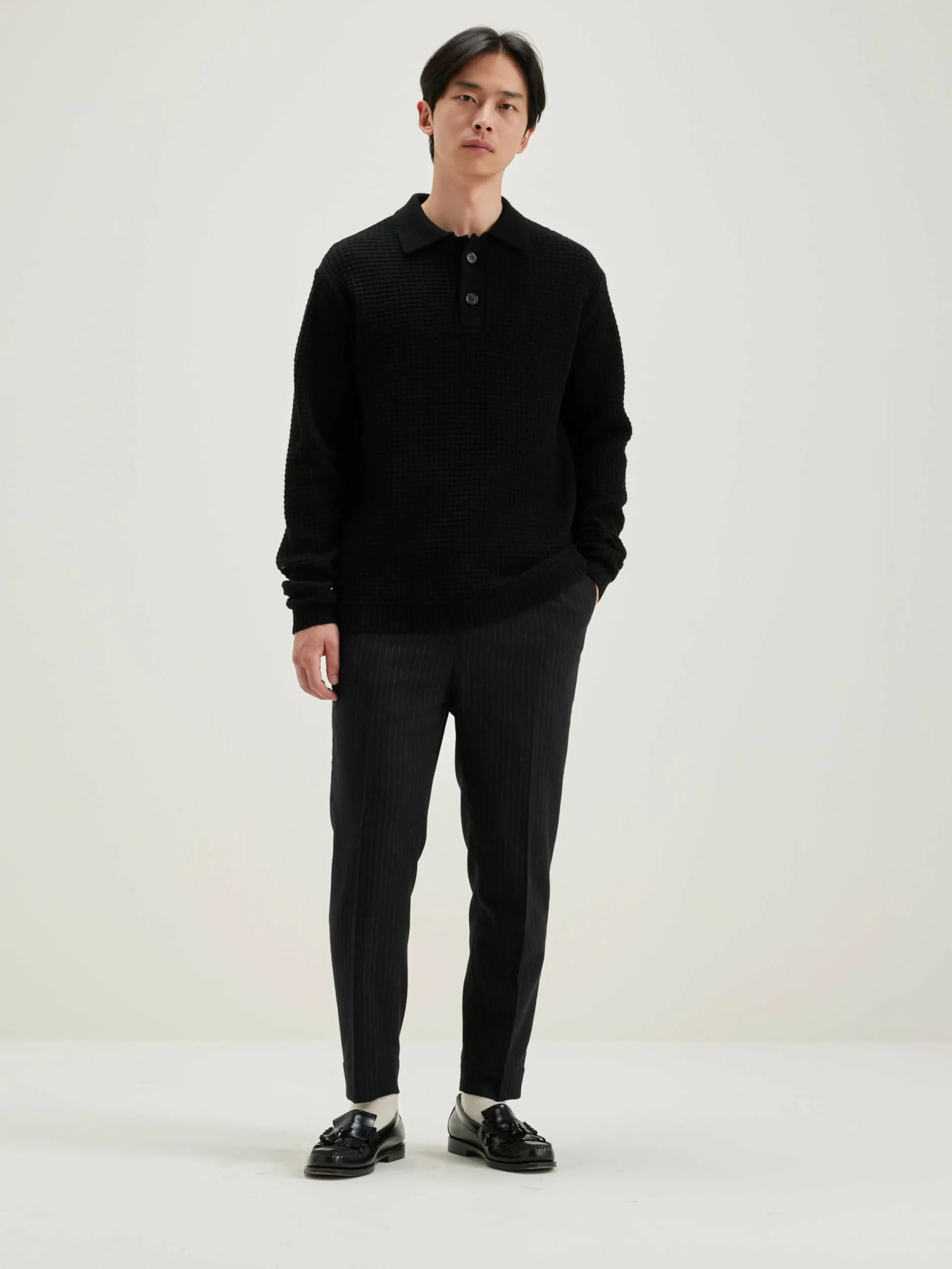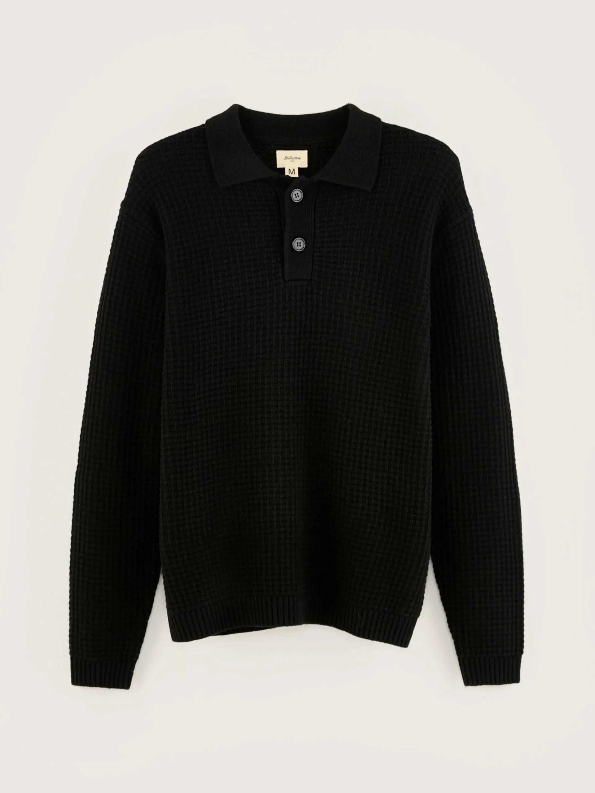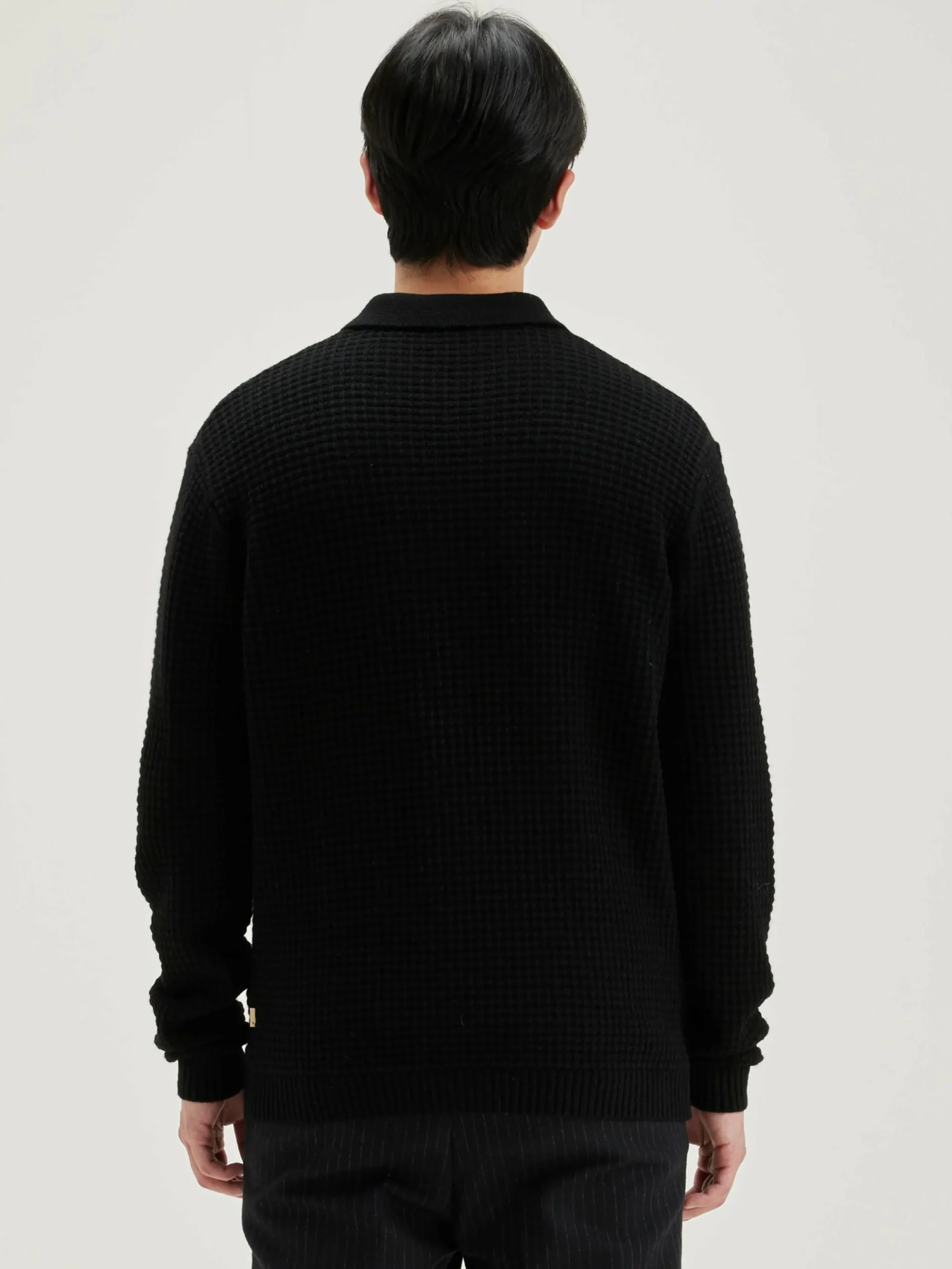 Comfortabele sweater in polostijl, van wafeltricot met zwarte wol.