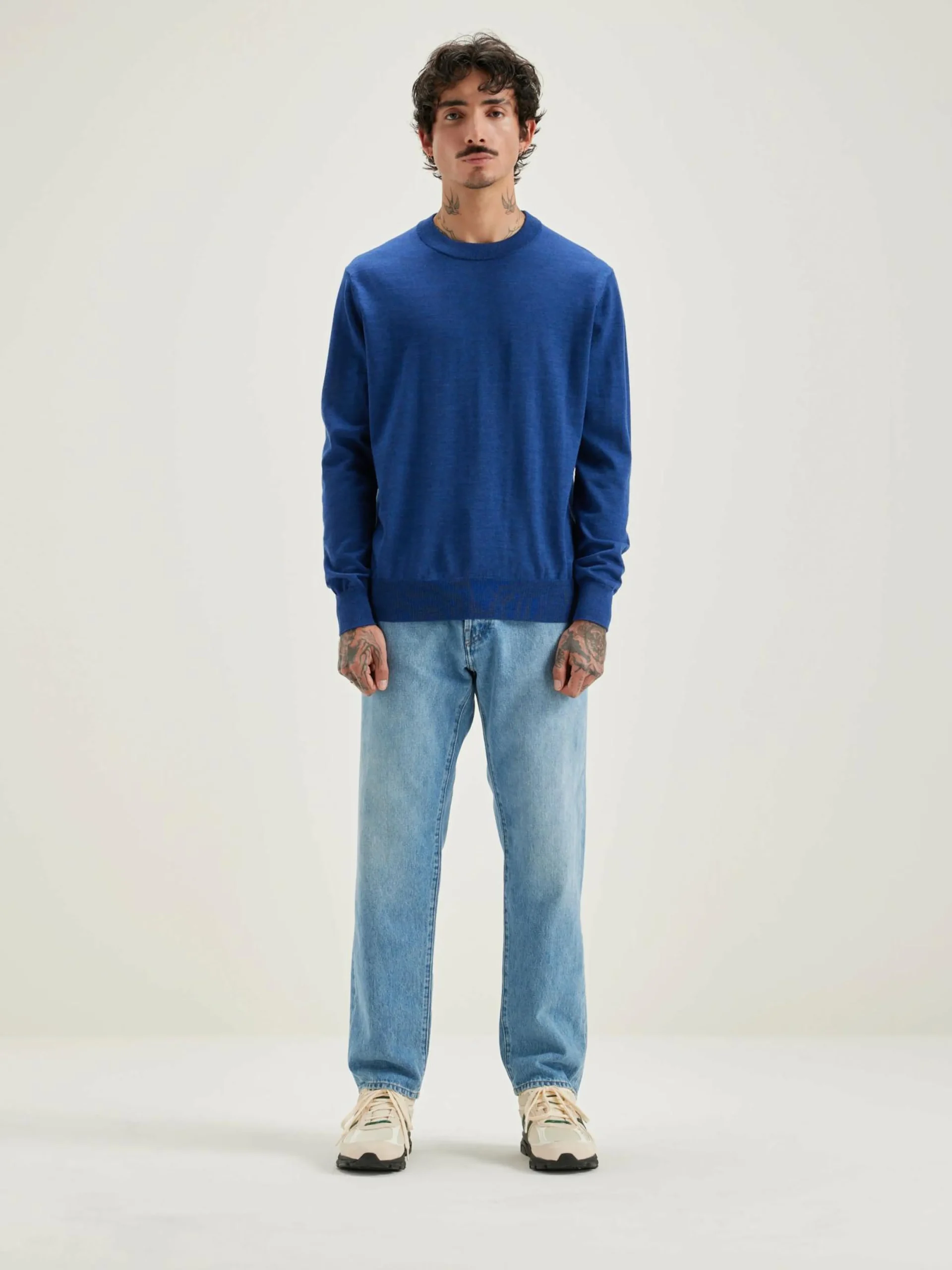 Klassieke, gemengd blauwe sweater met ronde hals, van superfijne merinowol.