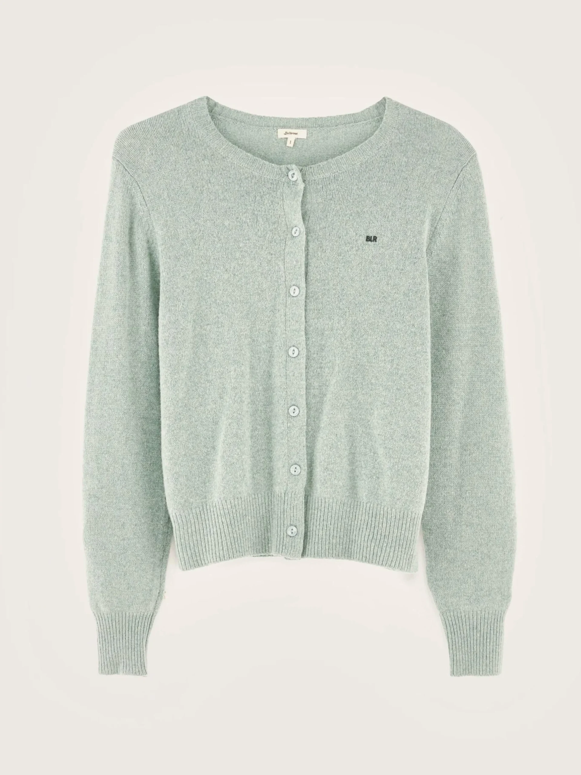 Aansluitende blauwgrijze gemeleerde cardigan met BLR-logo links op de borst.