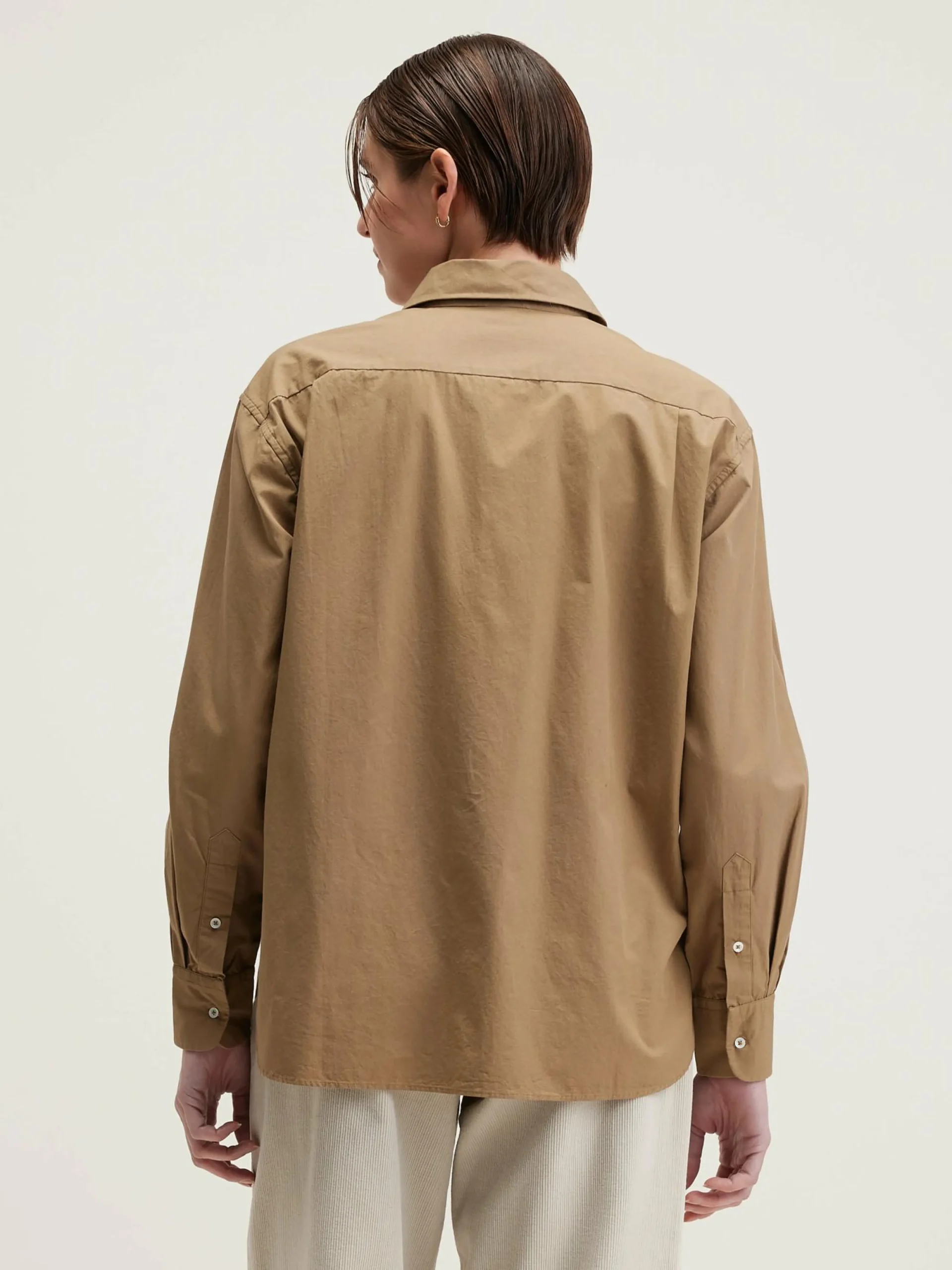 Oversized klassiek overhemd van geelbruine katoenpopeline.