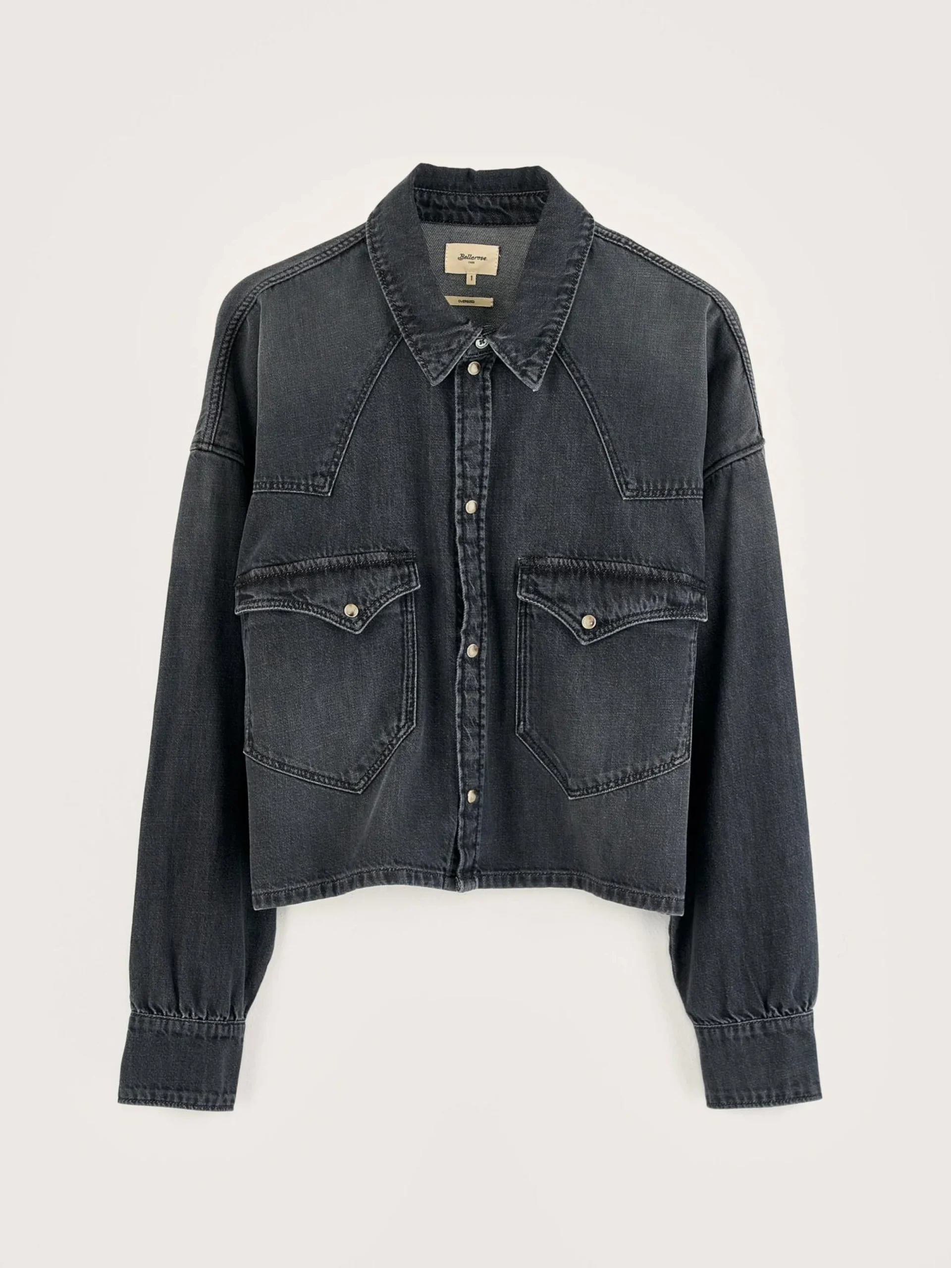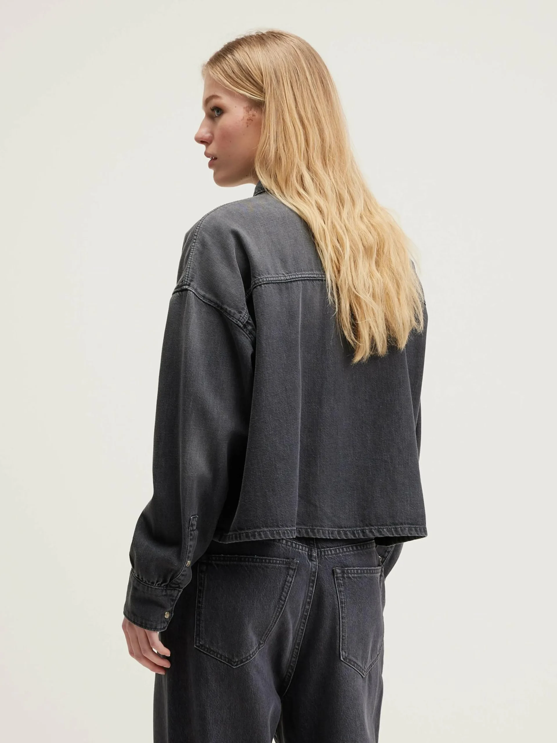 Oversized, cropped overhemd met westernlook, van afgesleten zwart katoendenim.