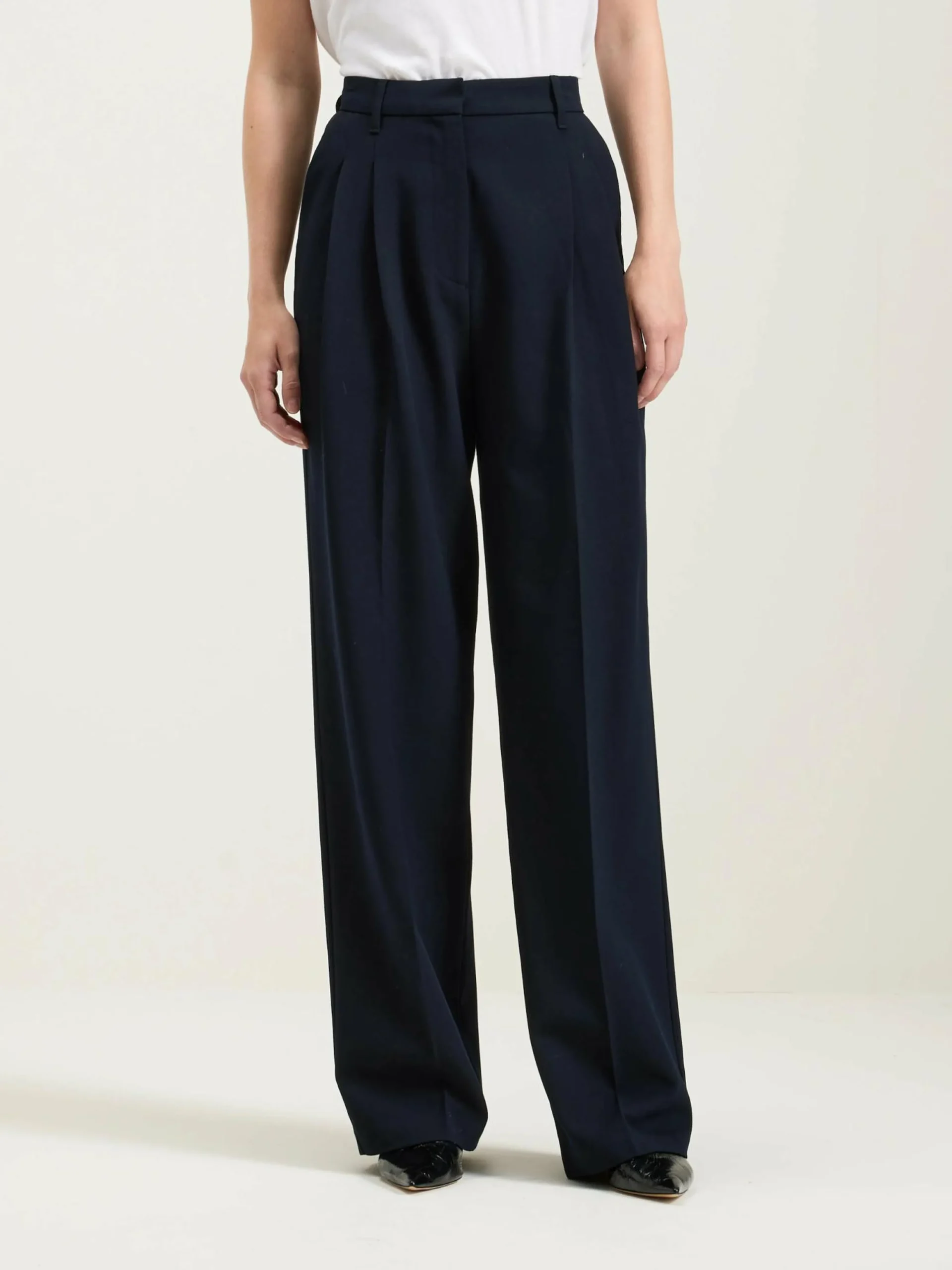 Geklede hoge taille broek met geplooide voorkant en wijde pijpen, in marineblauw.