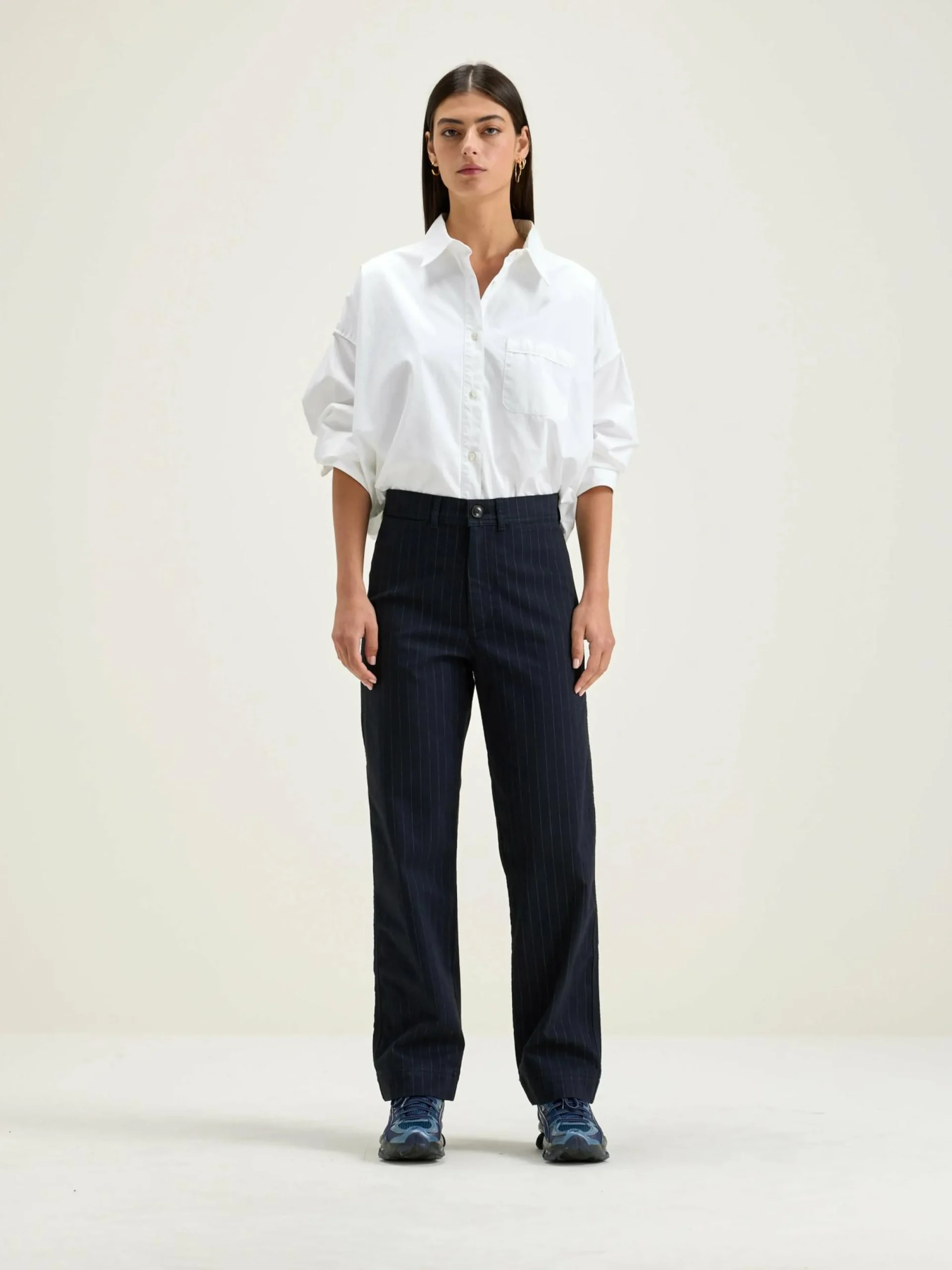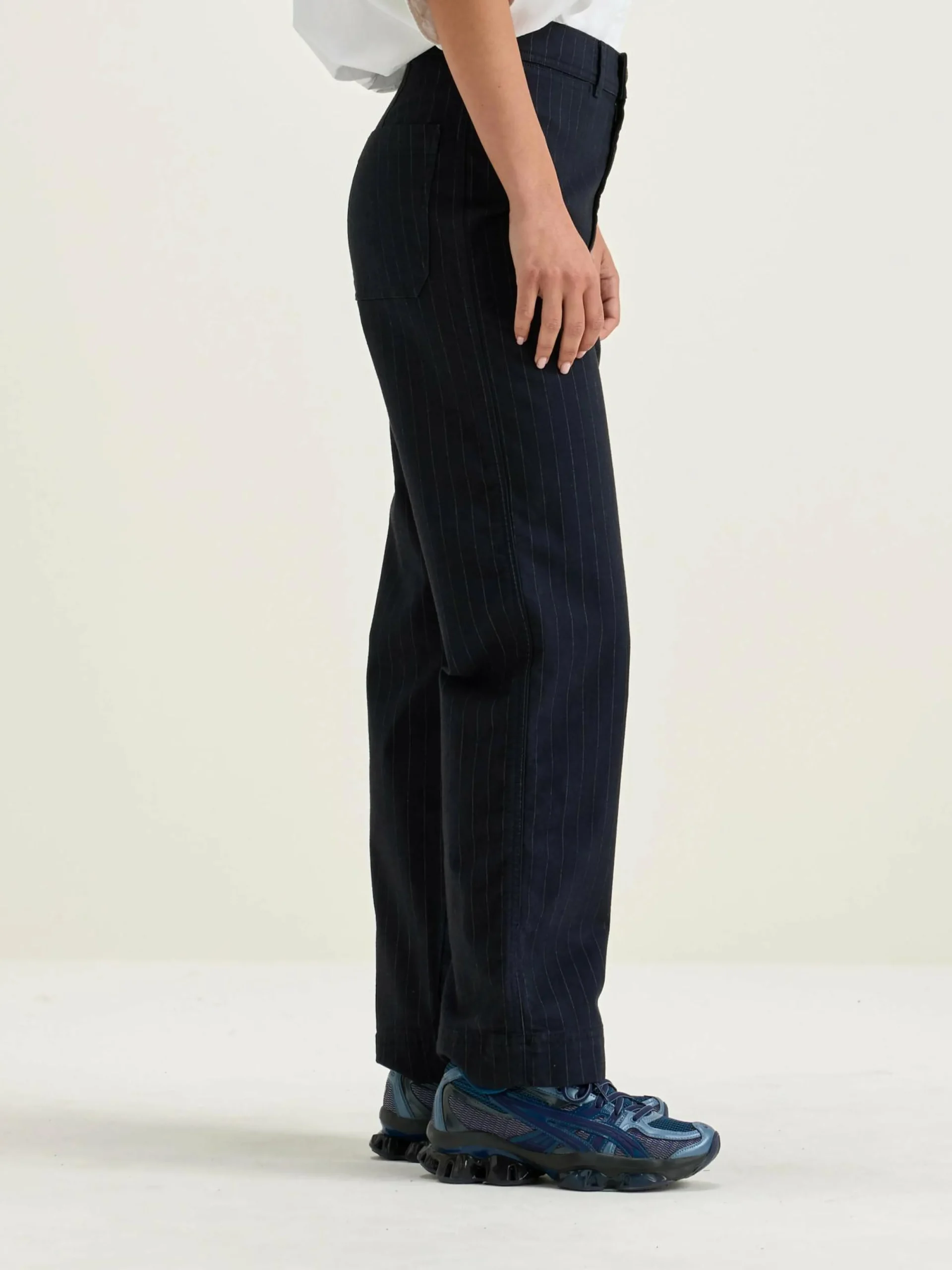 Aansluitende high-waist broek met rechte pijpen en subtiele krijtstreepjes in zwart.