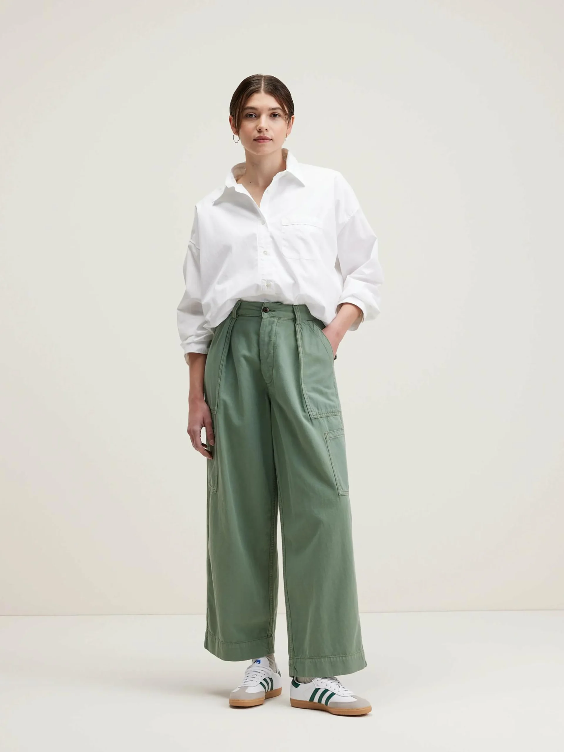 Klassieke cargo broek met wijde pijpen en fatigue-zakken in een eucalyptusgroene katoen en linnenmix.