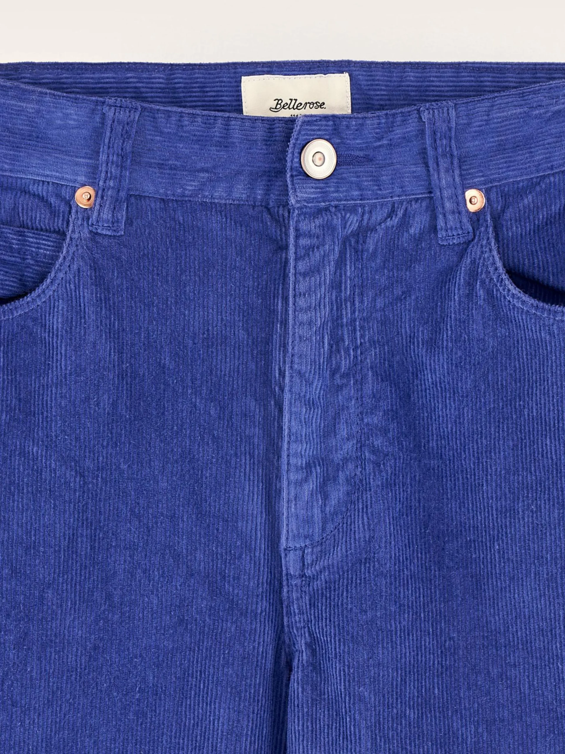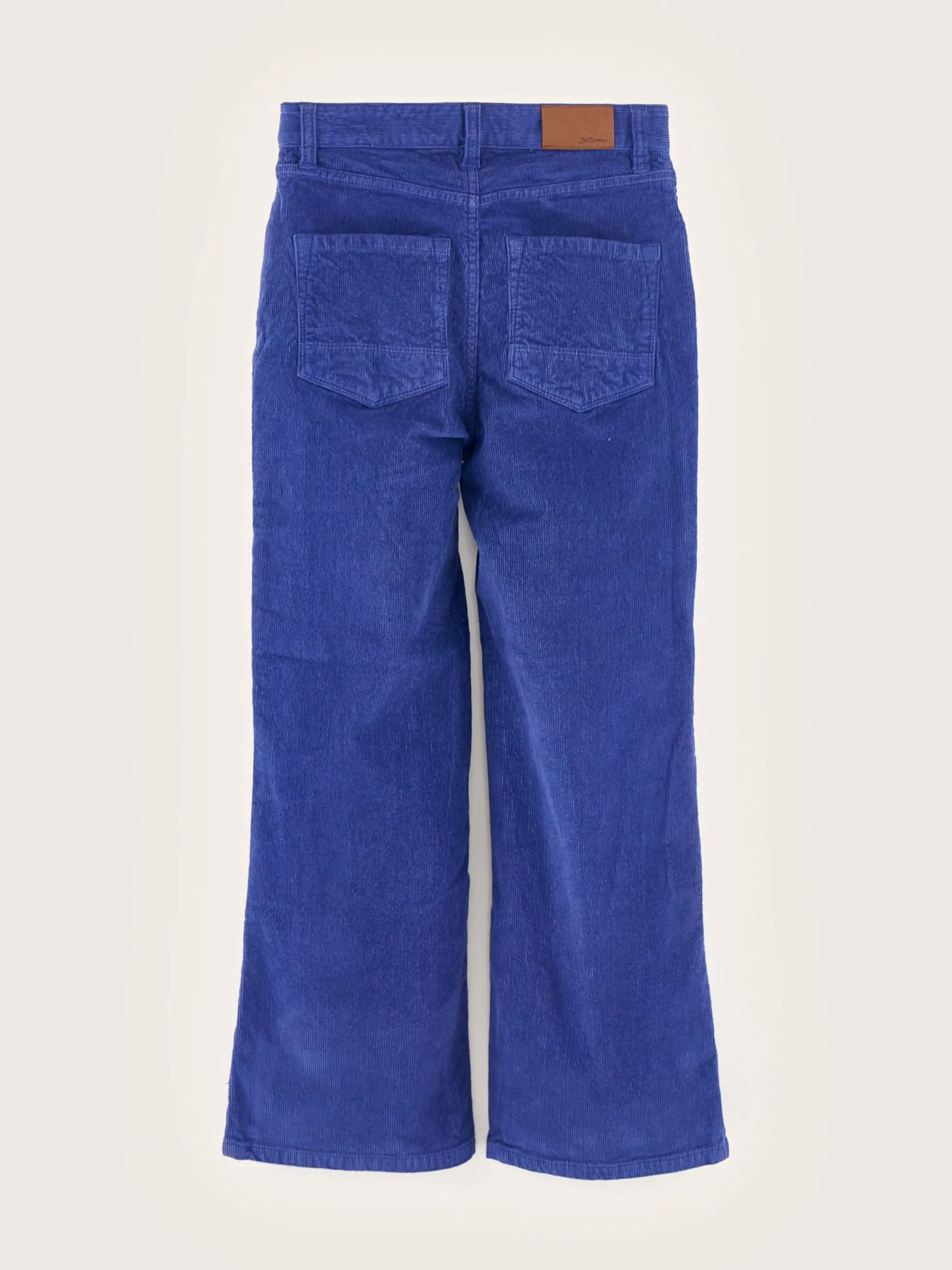 Blauwe broek met hoge taille en flared pijpen, van baby corduroy.