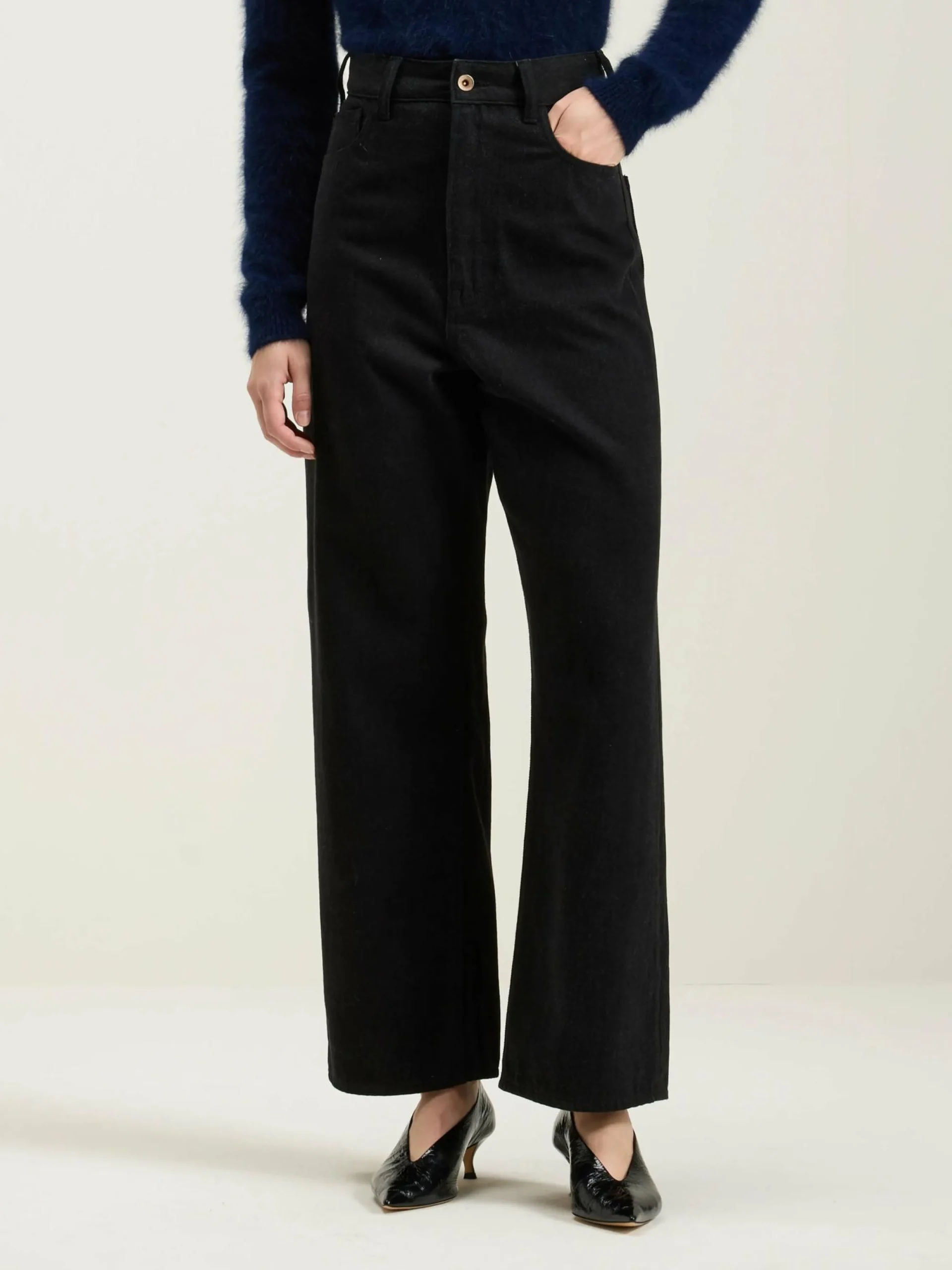 Super hoog getailleerde 5-pocket jeans met wijde pijpen, van off-black katoendenim.
