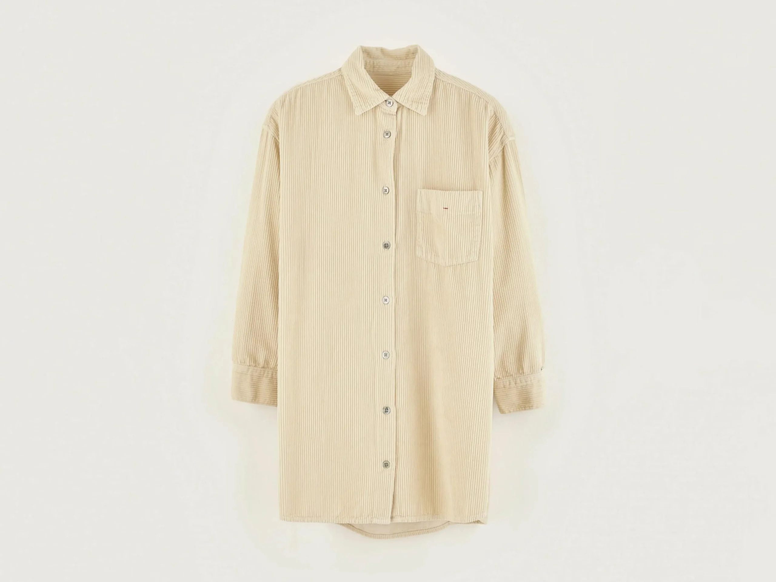 Korte jurk in hemdstijl, van lichtbruine katoenen corduroy.