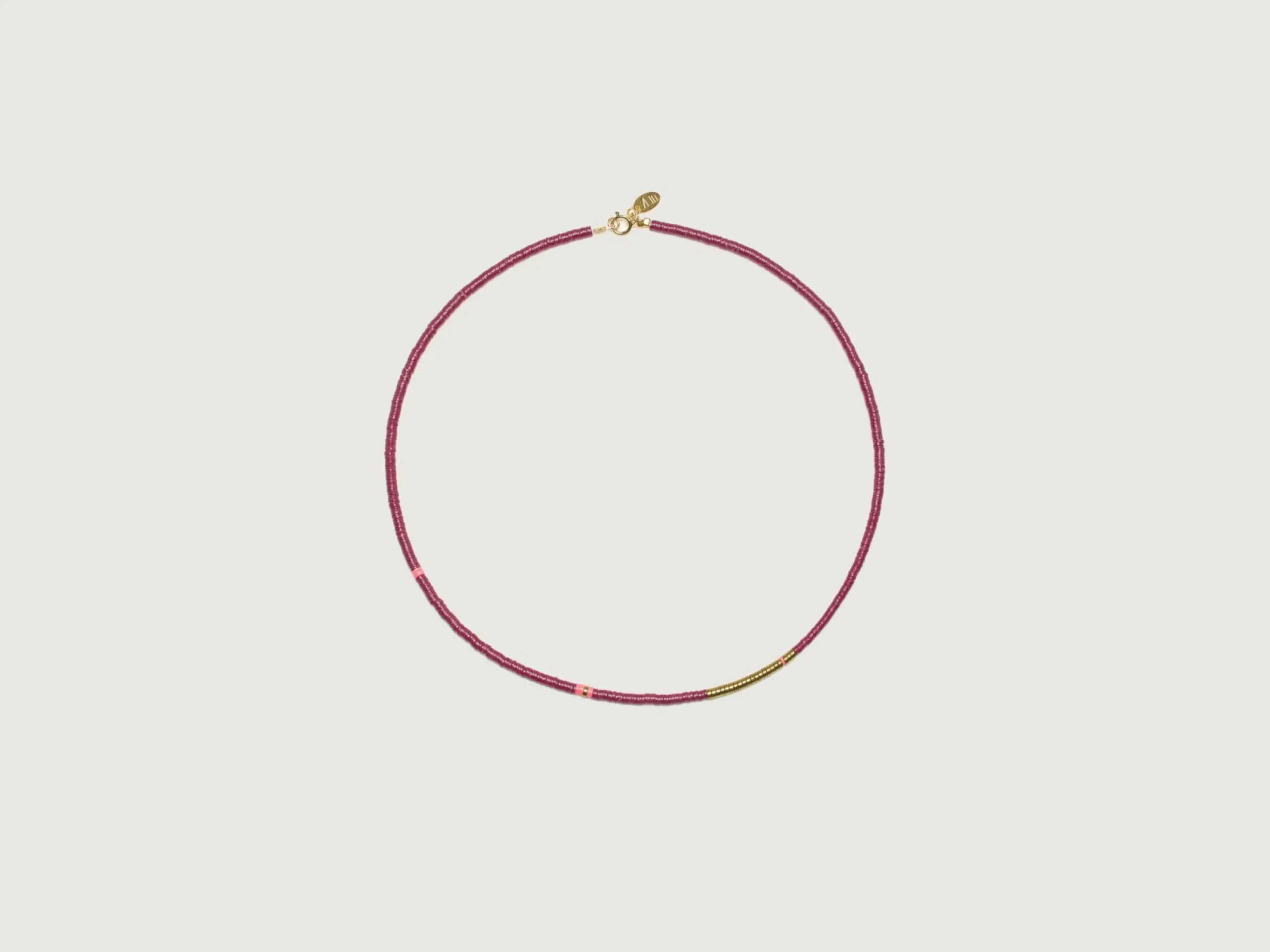 De Maison Mönik Prune 3 handgemaakte ketting is gemaakt van gerecycled Ghanees vinyl en metallic hematietkralen.