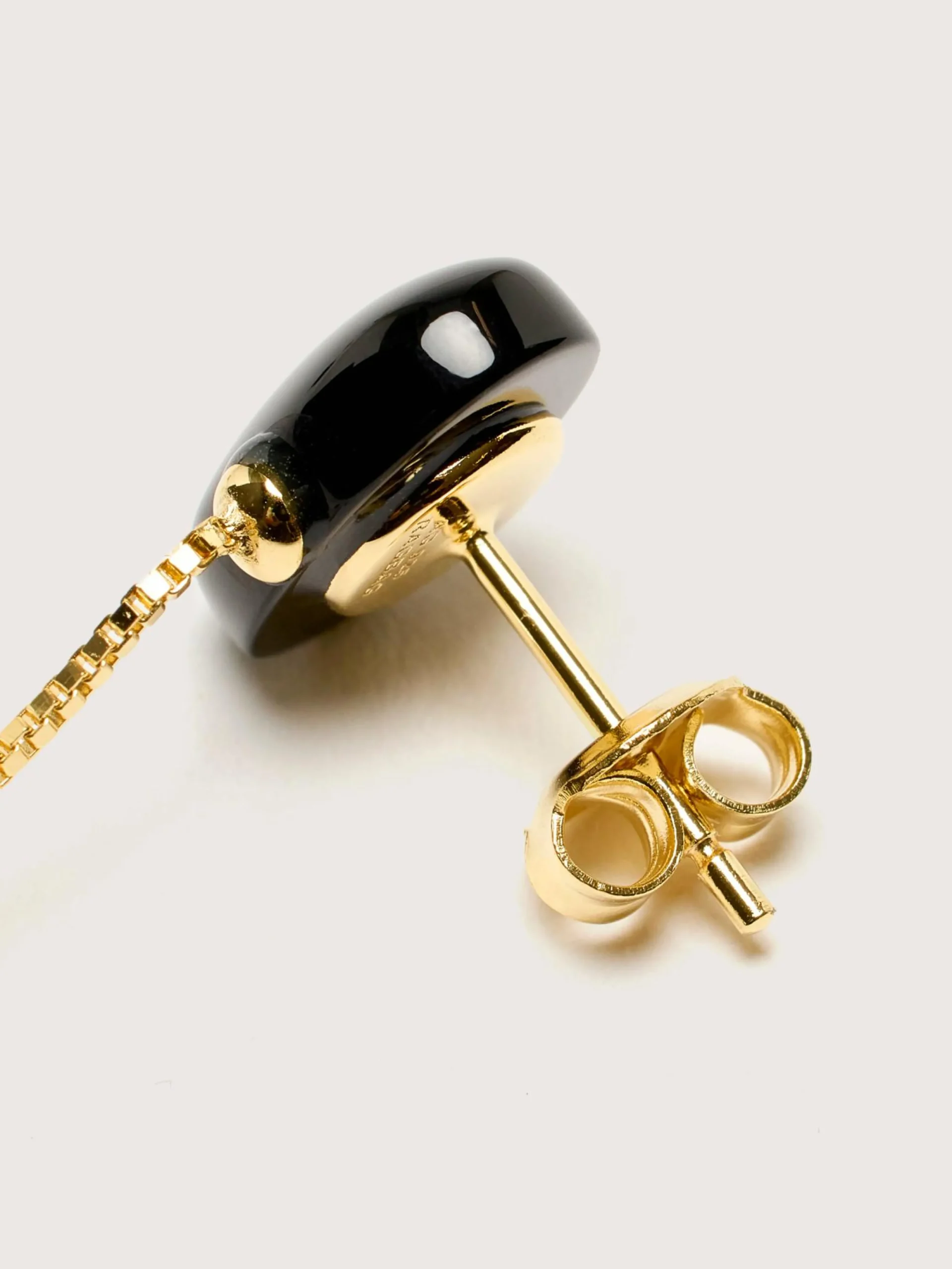 De RAGBAG Dualism lange oorbellen zijn gemaakt van zoetwaterparels en zwarte onyx, hangend aan vergulde zilveren kettingen.