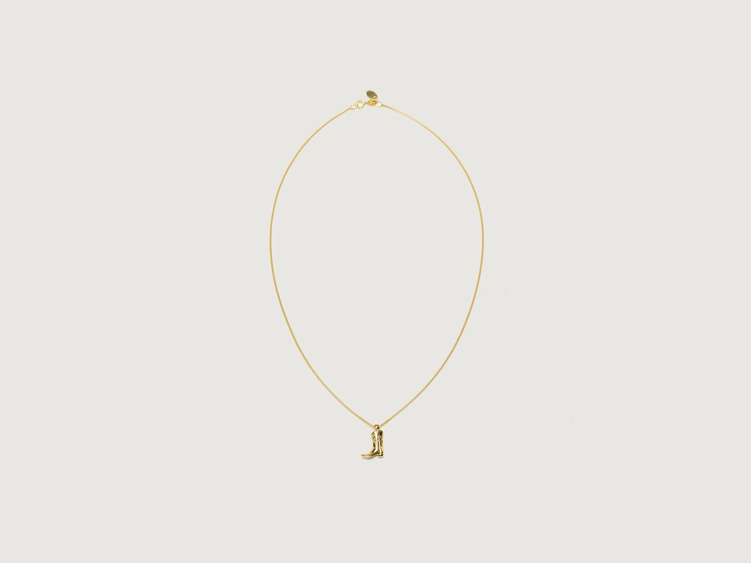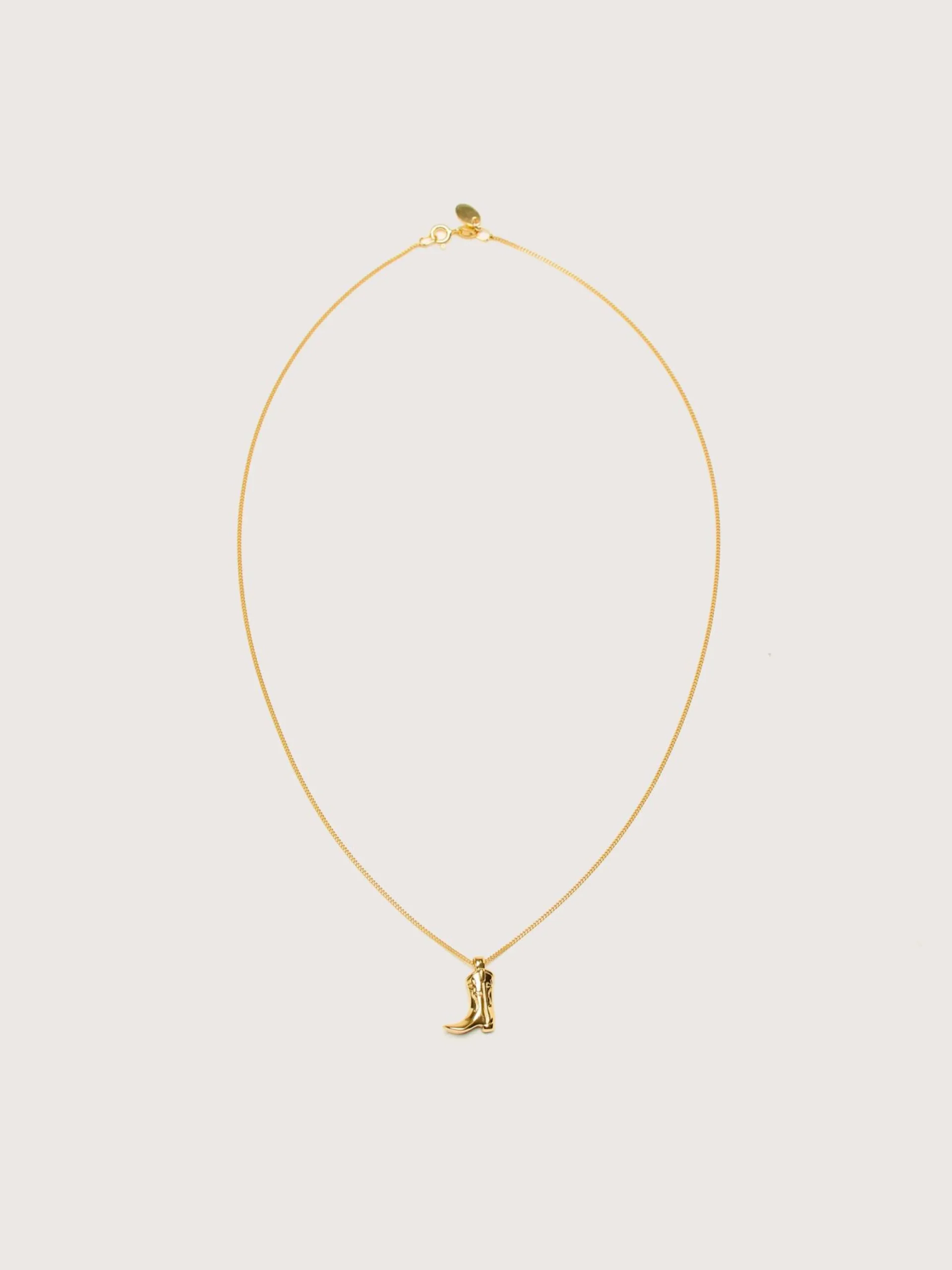 The Wolf Circus Cowboy Boot Charm Necklace has a small boot pendant on a gold-plated curb chain.