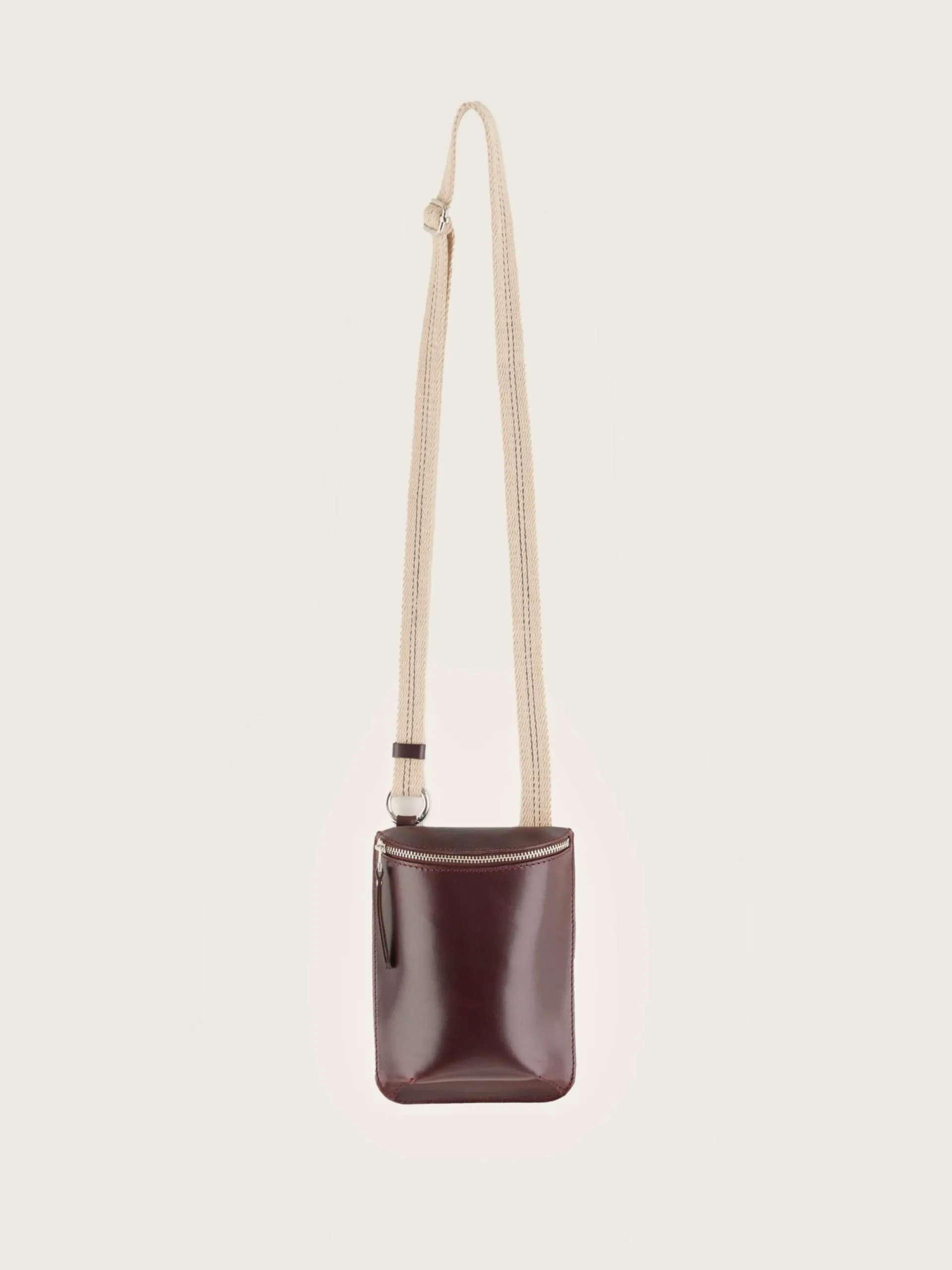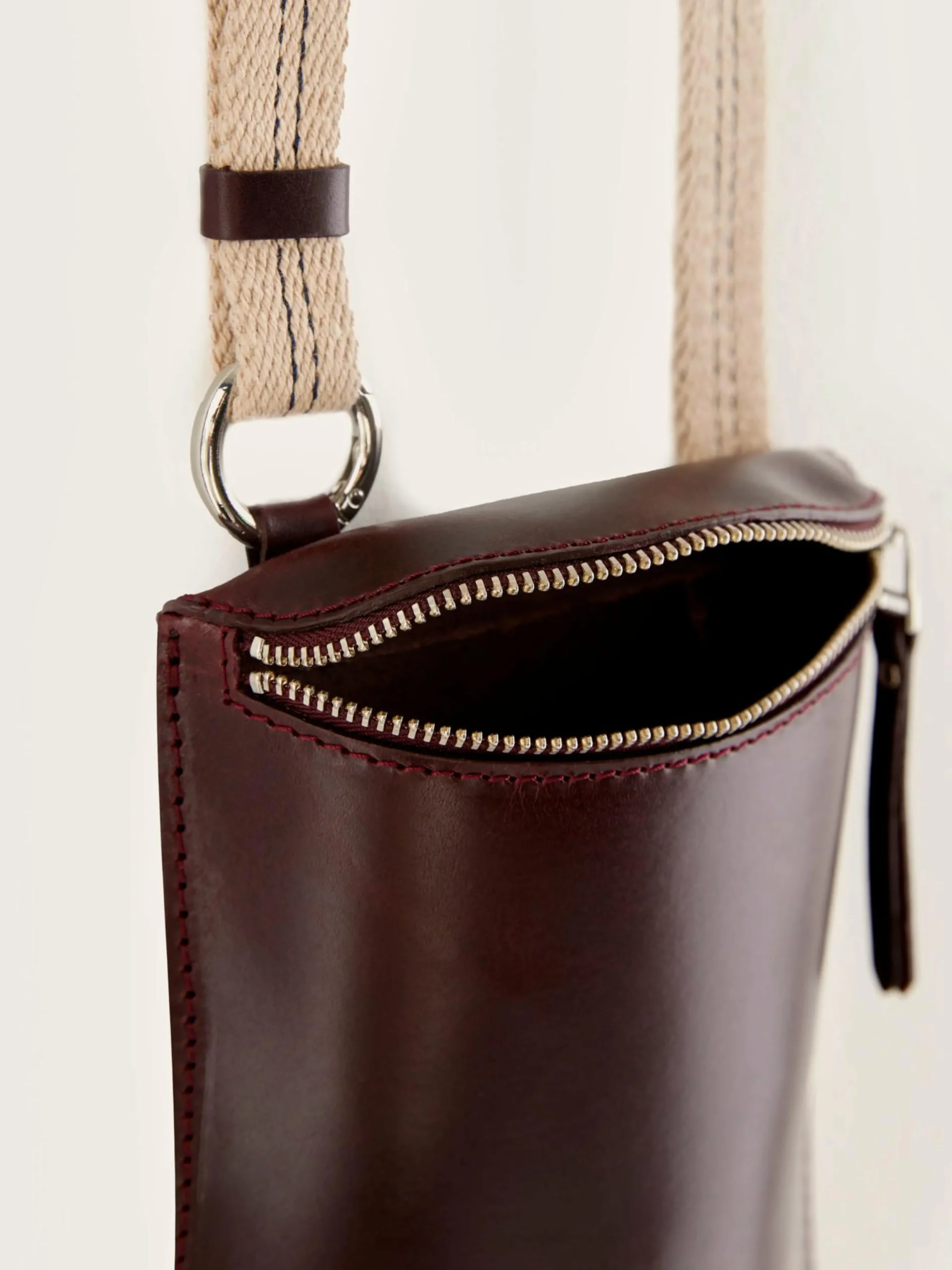Mini tas met ritssluiting van soepel bordeauxrood leer met een kenmerkende dubbel gestikte riem.