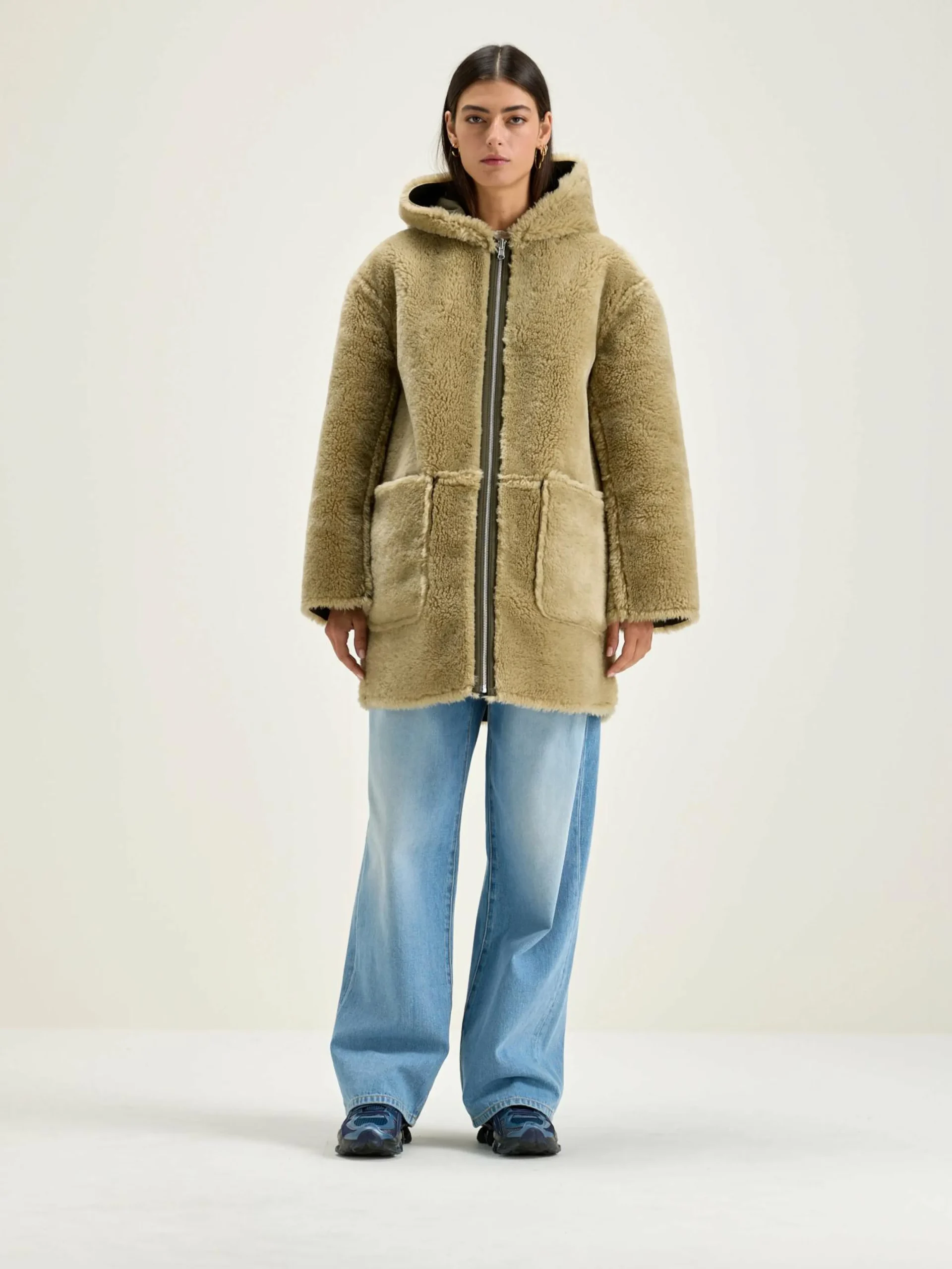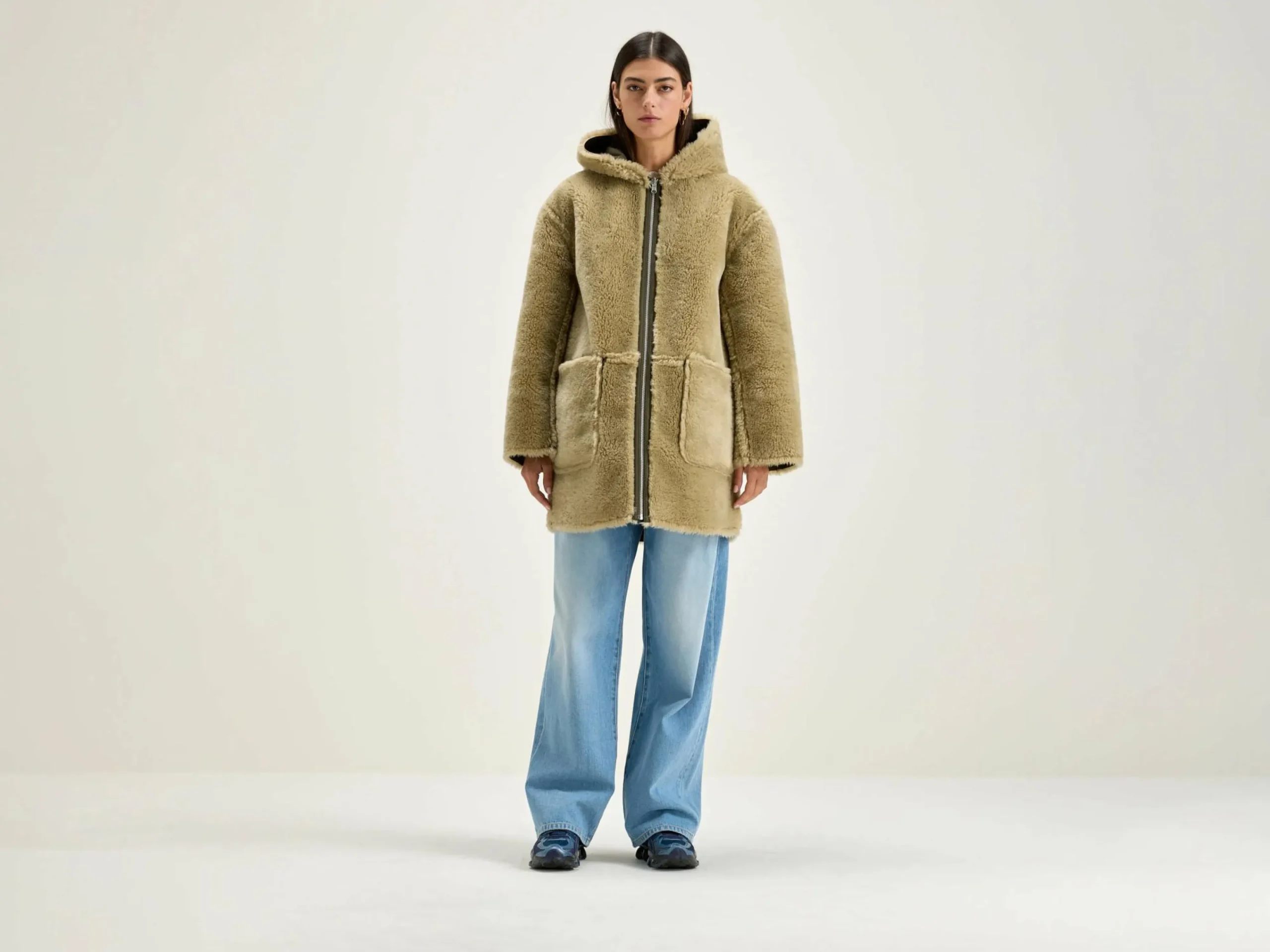 Omkeerbare mantel met capuchon, met ritssluiting en klepzakken vooraan, van mosgroen imitatie-shearlingleer.