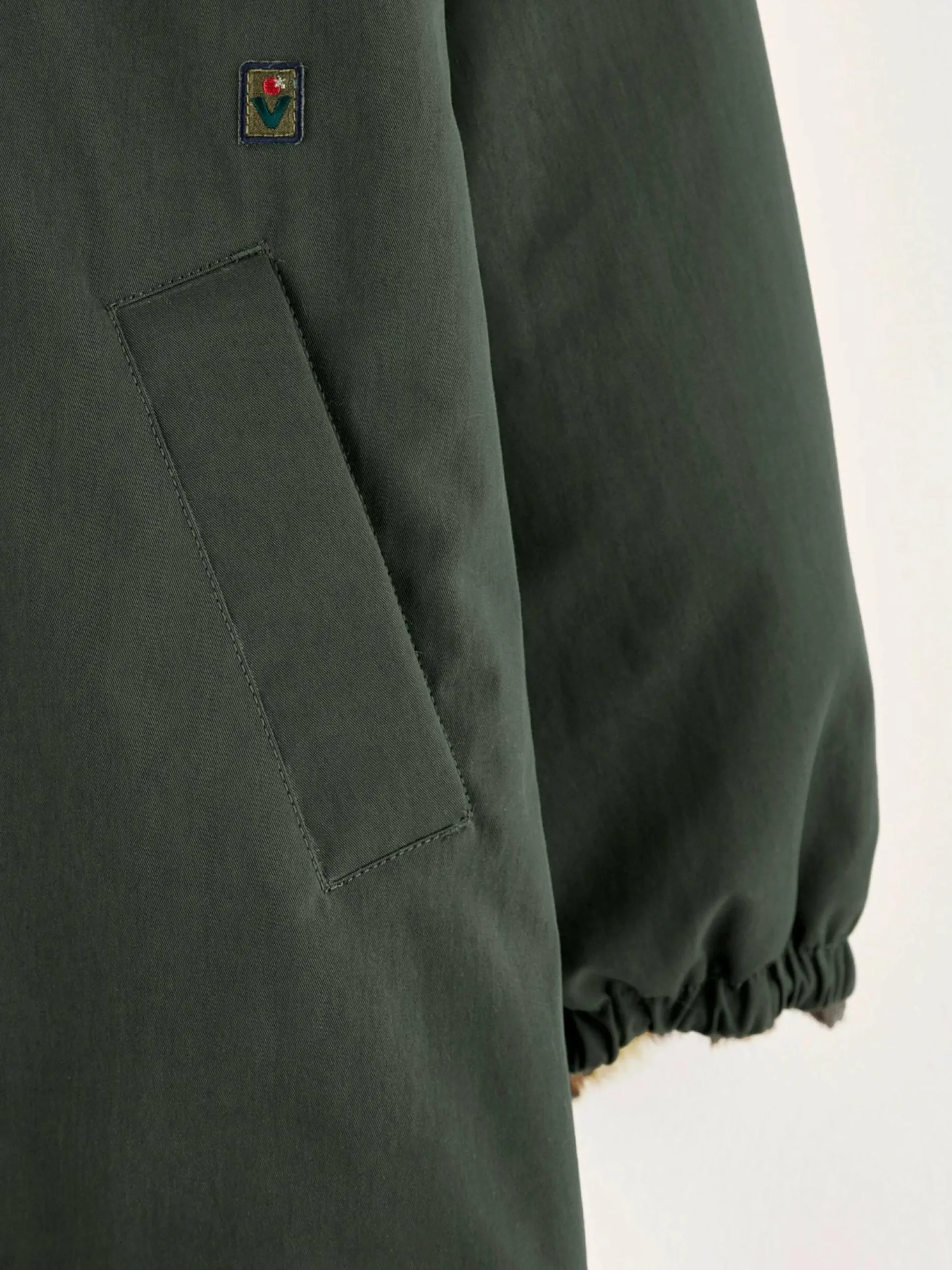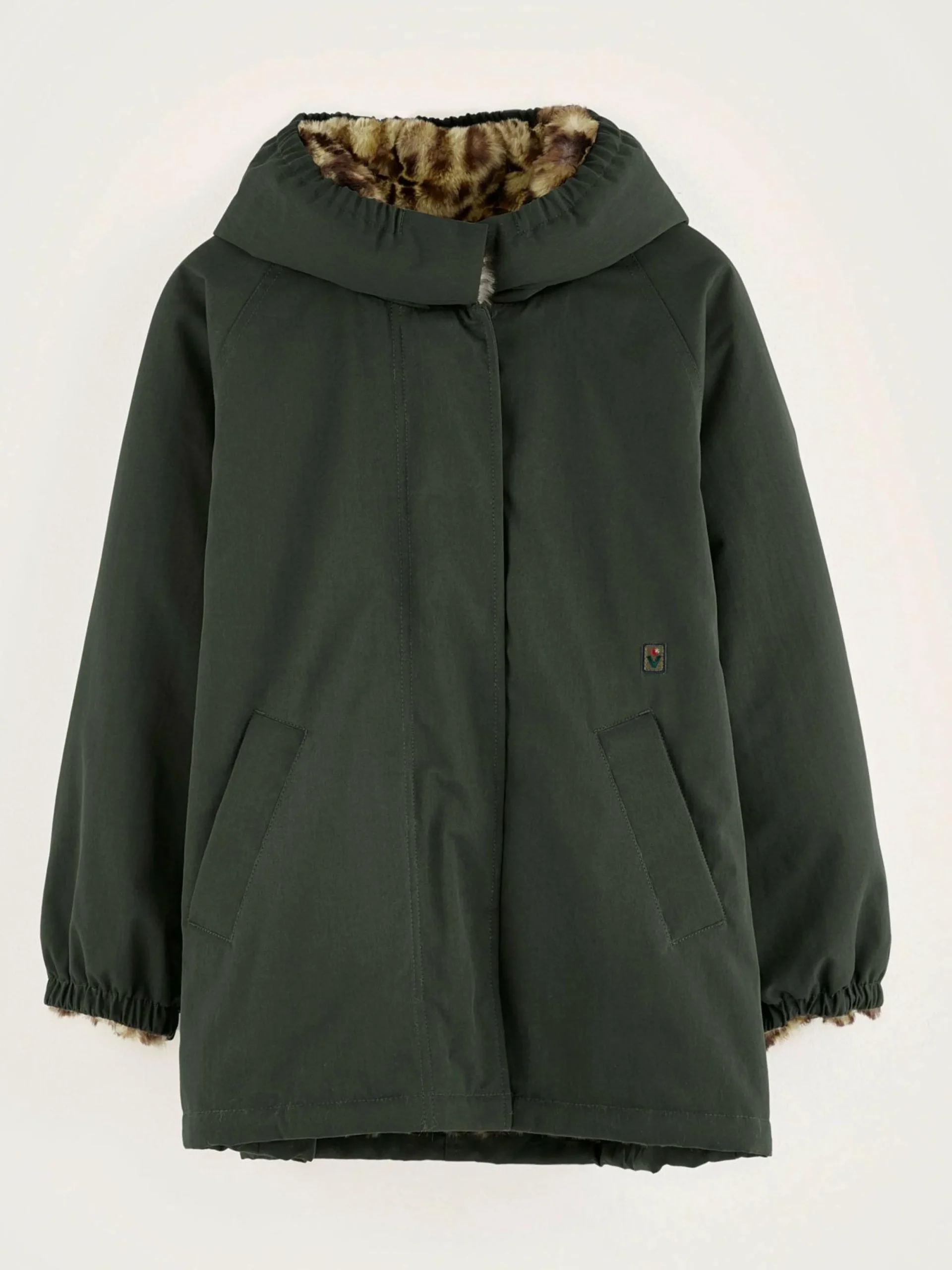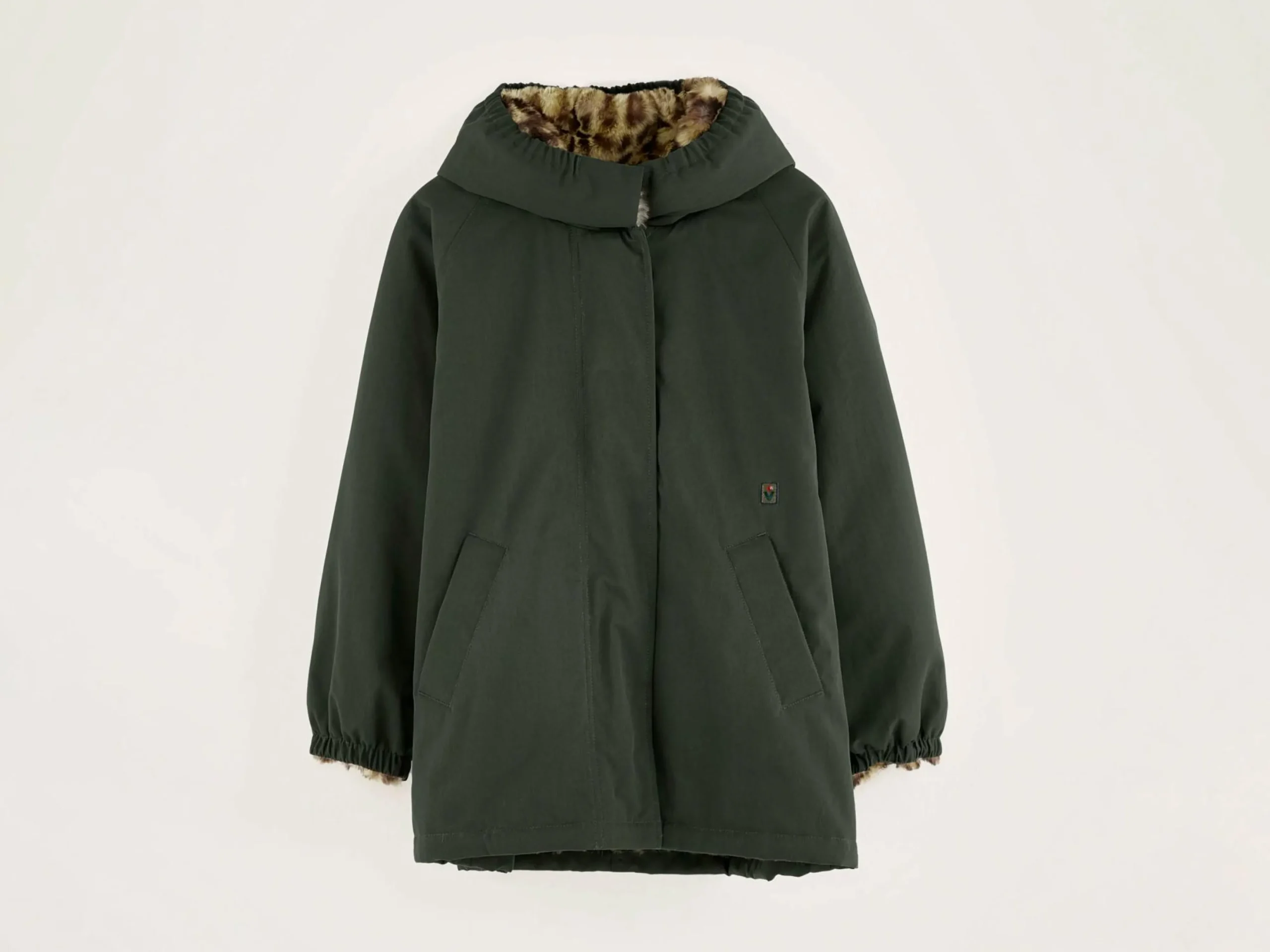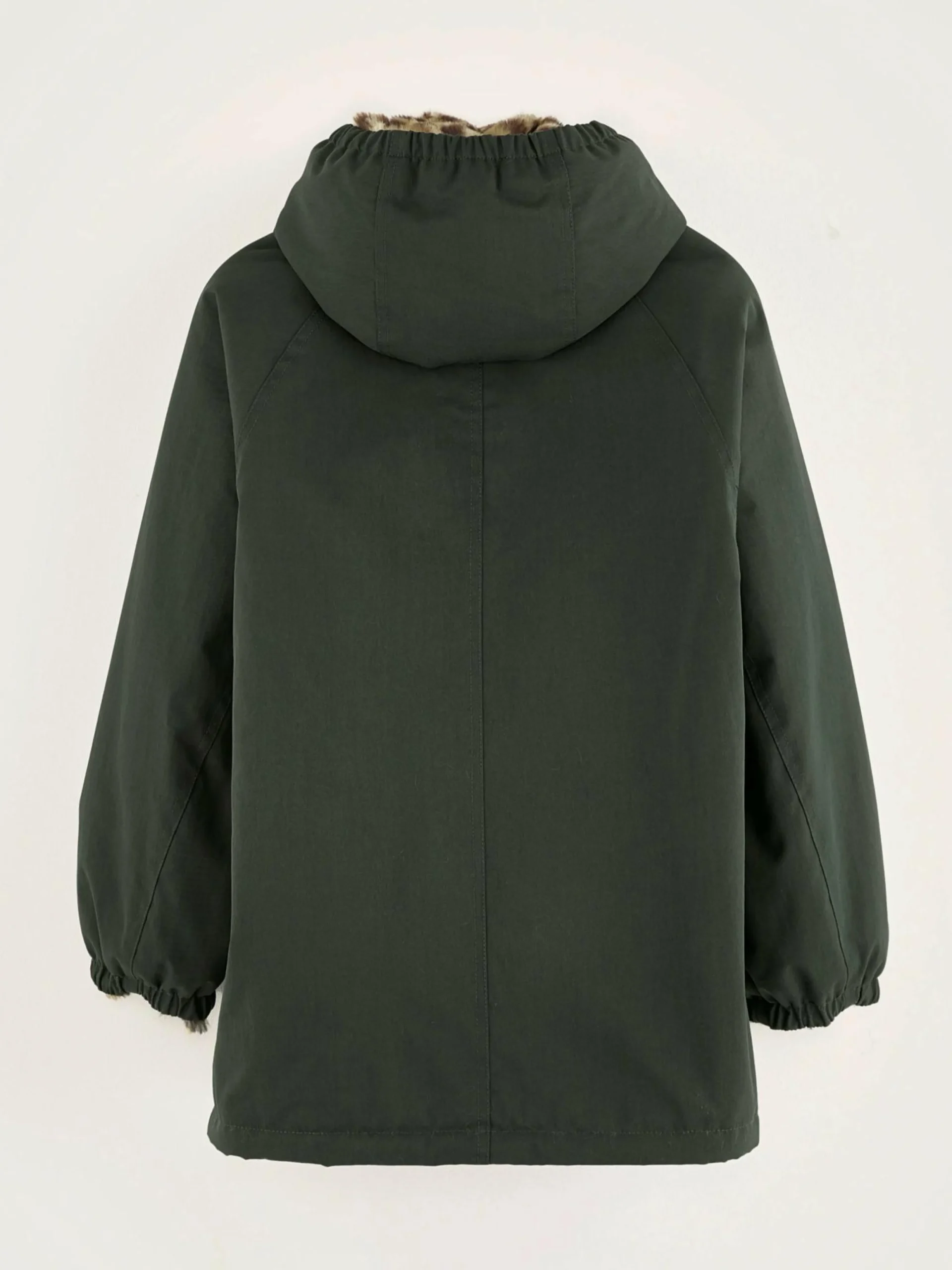 Bosgroene oversizede parka met capuchon, met voering van nepbont.