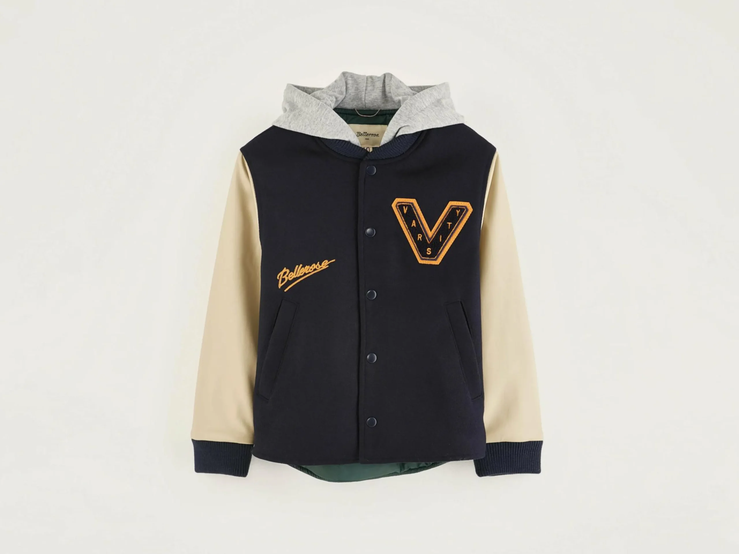 Varsity jacket met contrasterende mouwen, capuchon in jersey stof, en contrasterende Bellerose embroidery.