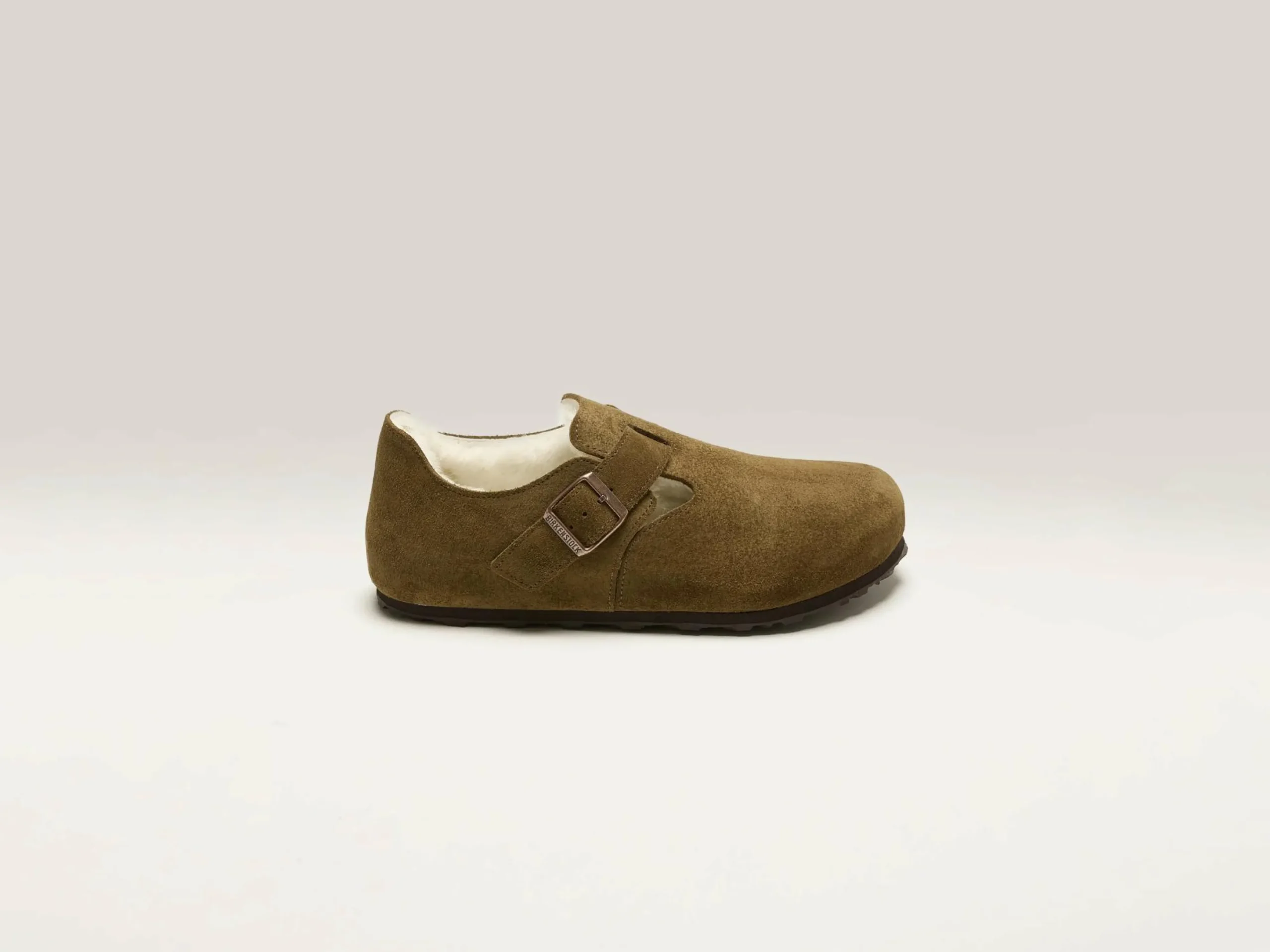 De Birkenstock London Shearling hebben een suède bovenwerk gevoerd met lamsvel en een kurken voetbed ook gevoerd met lamsvel.