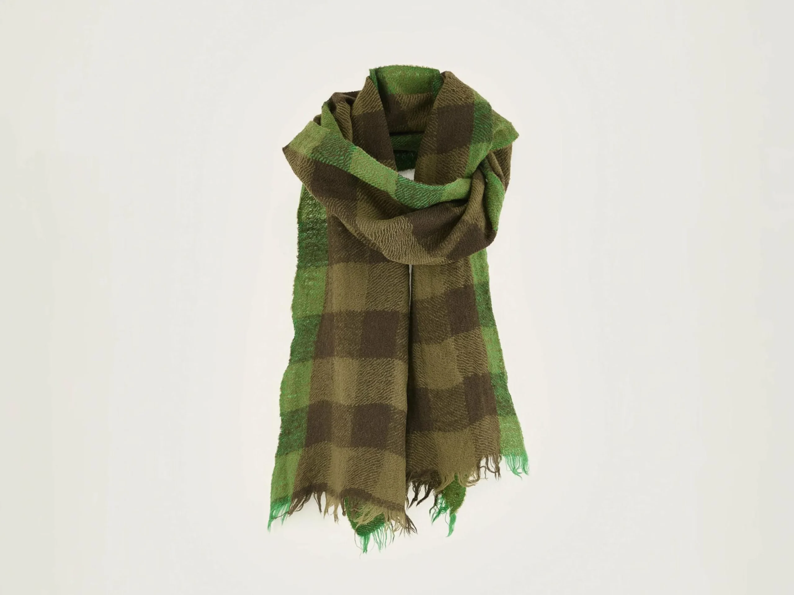 Klassiek geweven wollen sjaal met groene ruiten en franjes aan de randen.
