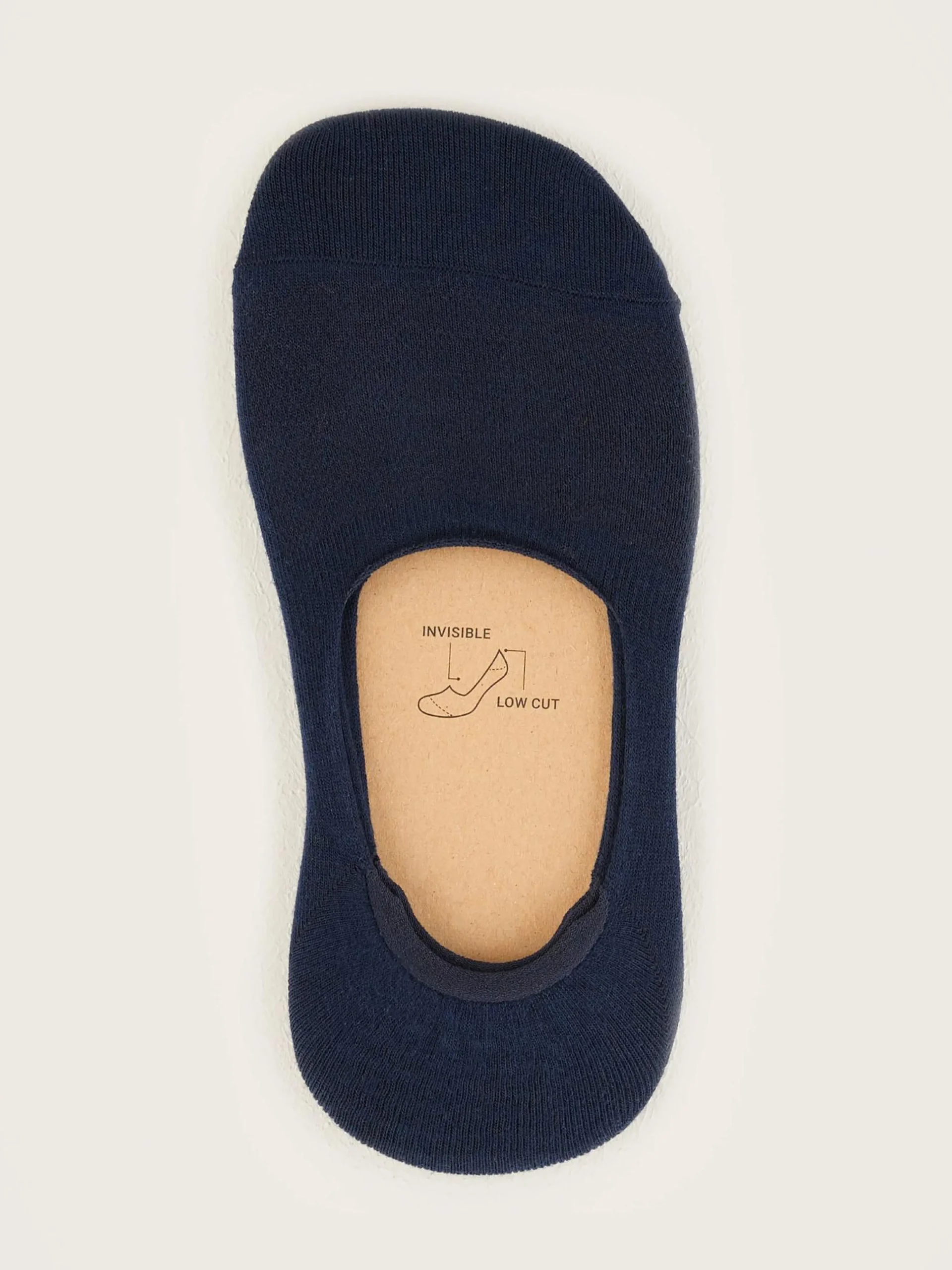 Klassieke enkelsokken in marineblauw met geribd breisel rond de voet en antislipgum achterop de hiel.