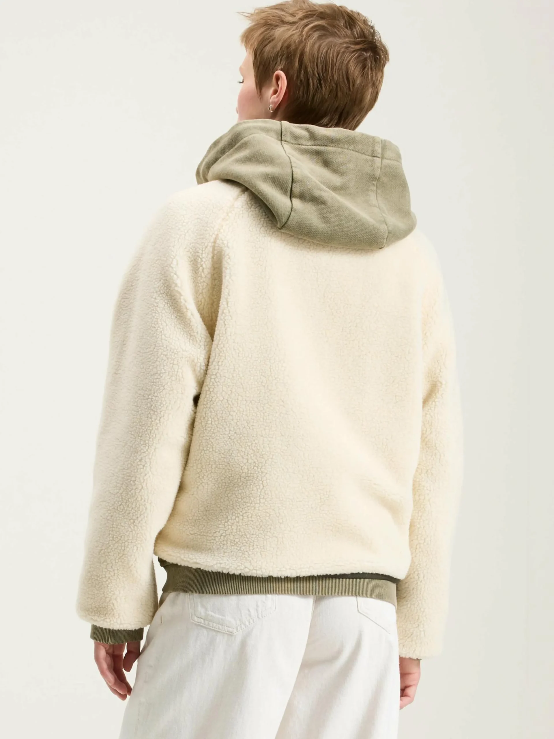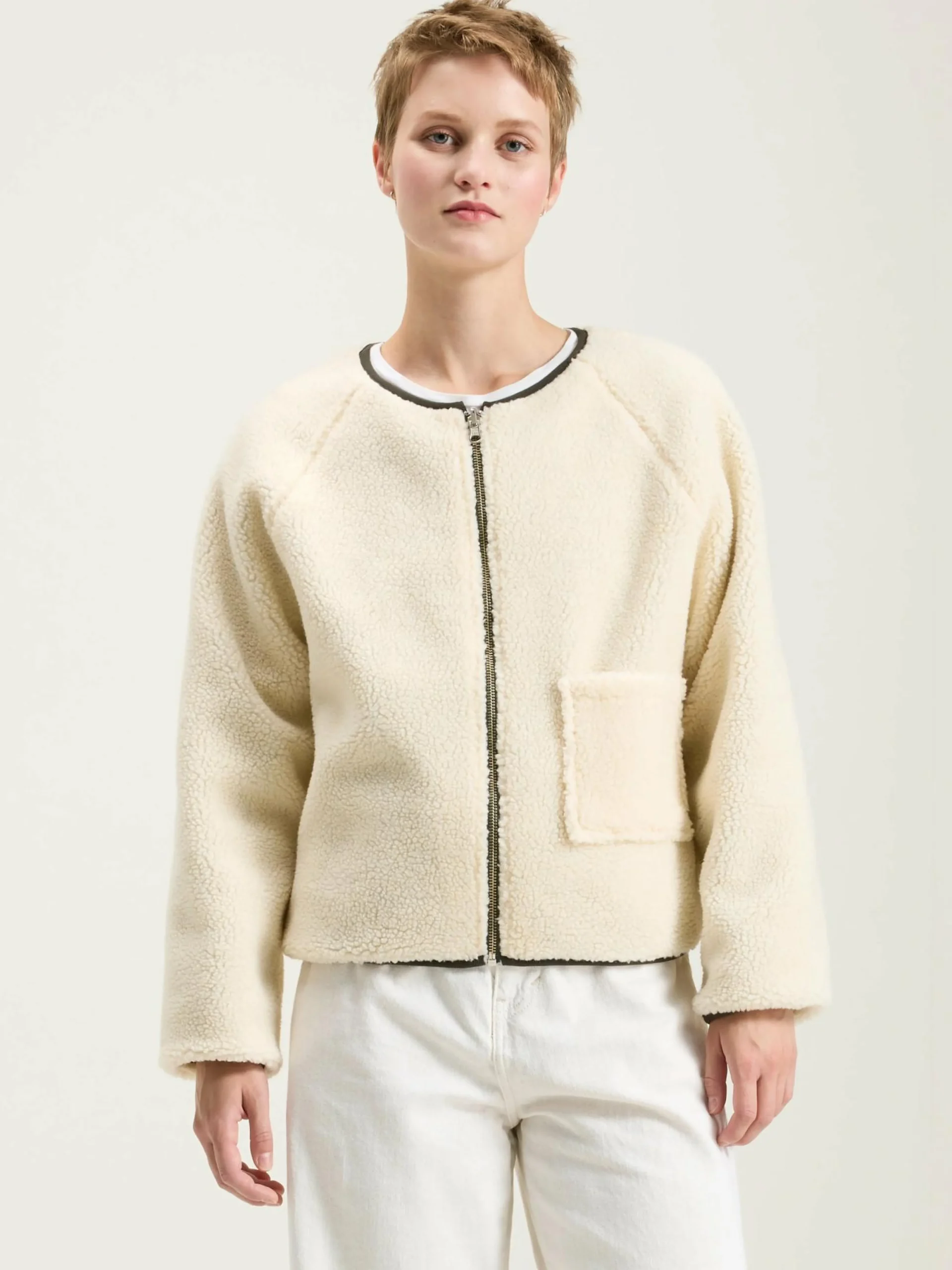 Omkeerbare jas met rits aan de voorkant en steekzakken. Eén kant in kaki satijn en de andere in ecru teddy.