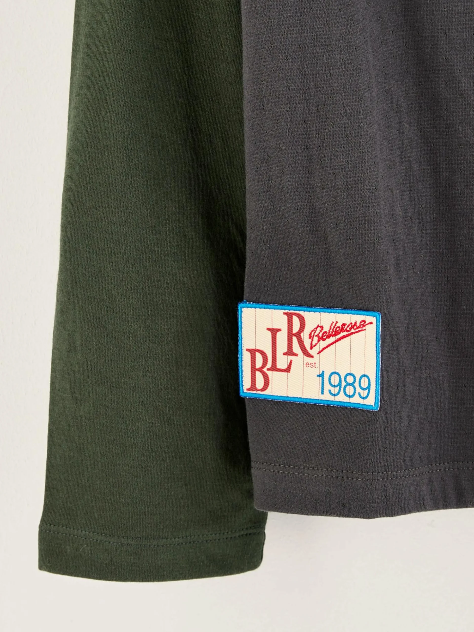 Recht T-shirt met raglanmouwen van tweezijdig donkerblauw kartoenjersey, met “Rhythm” print op de voorkant.