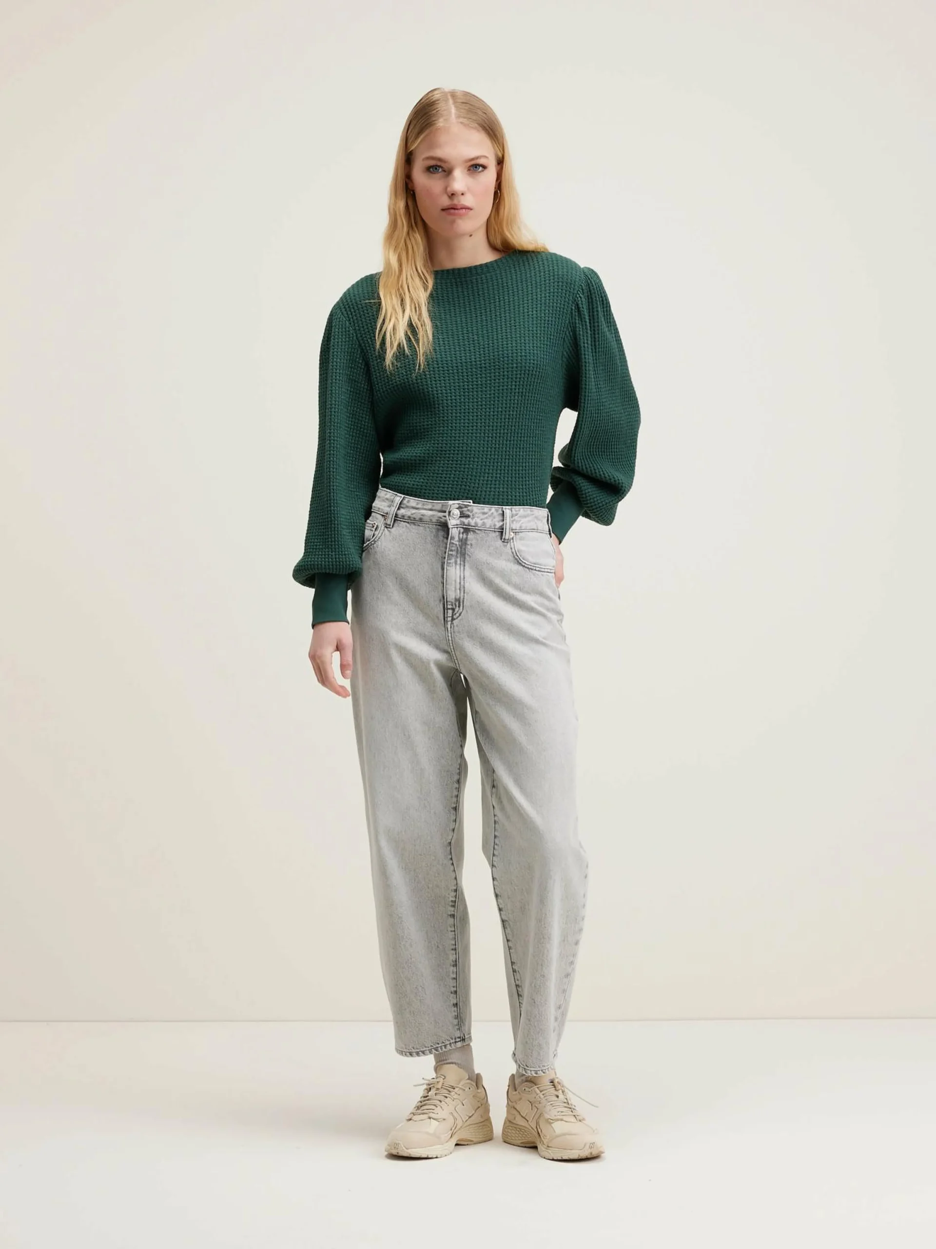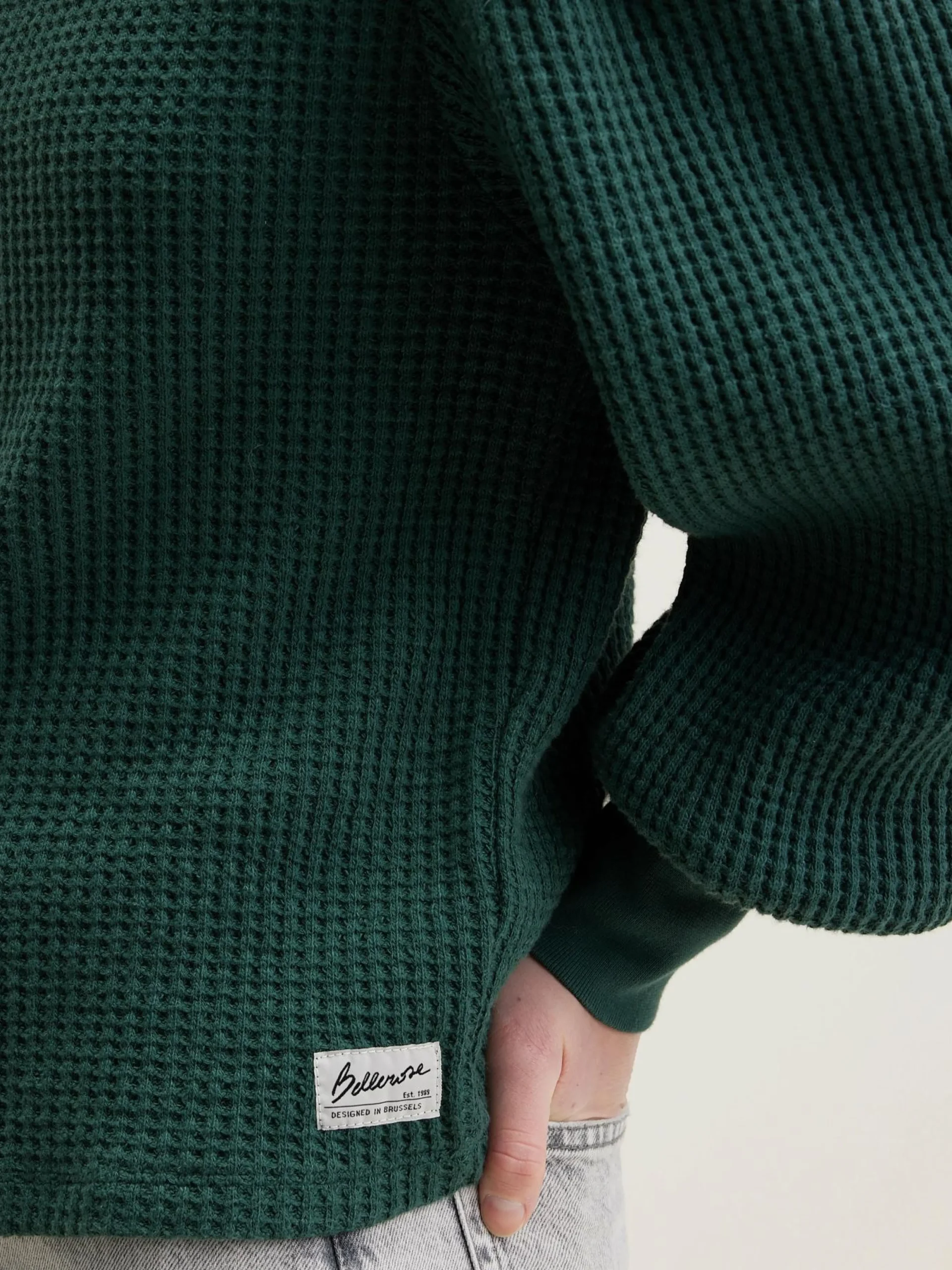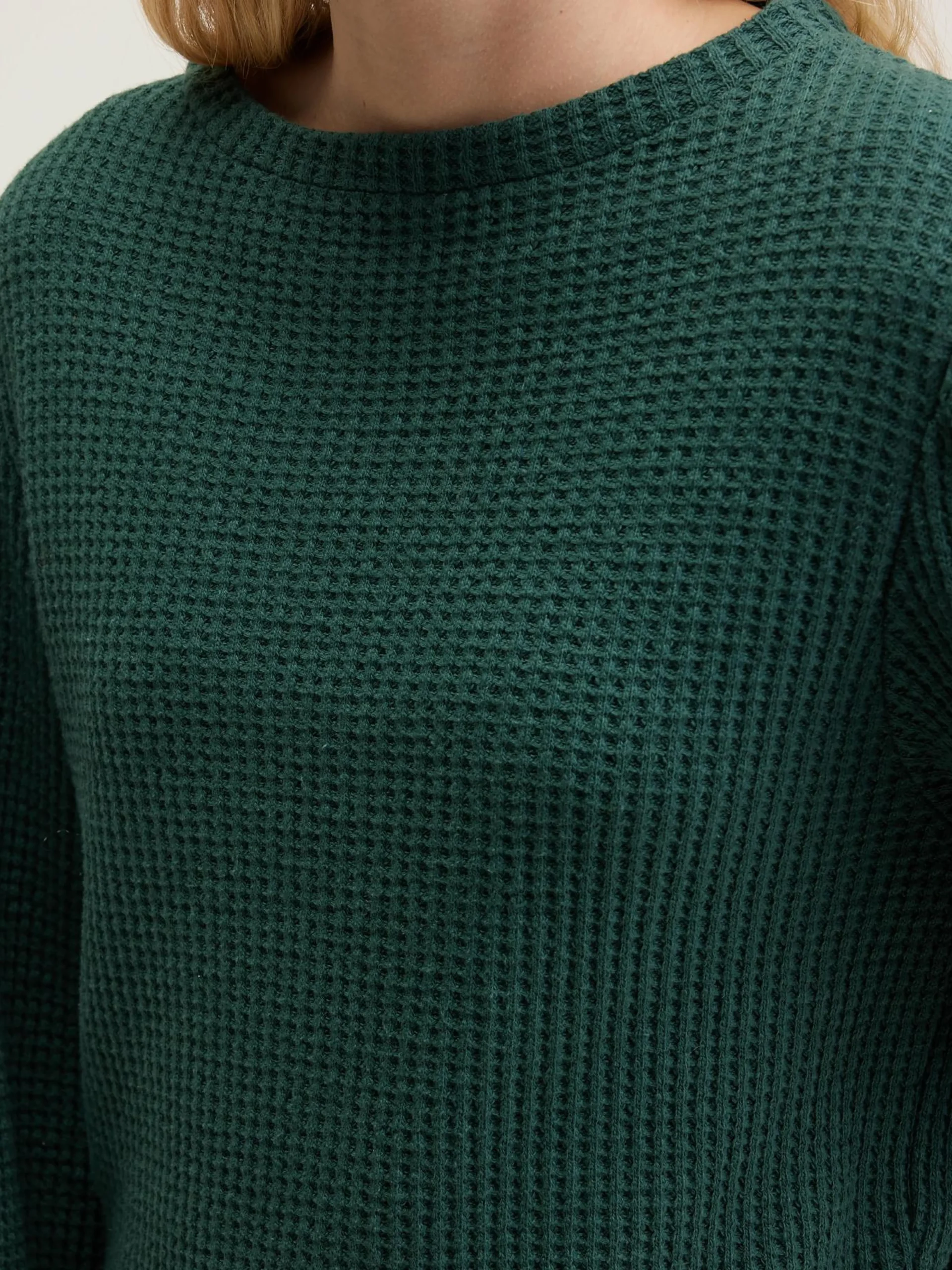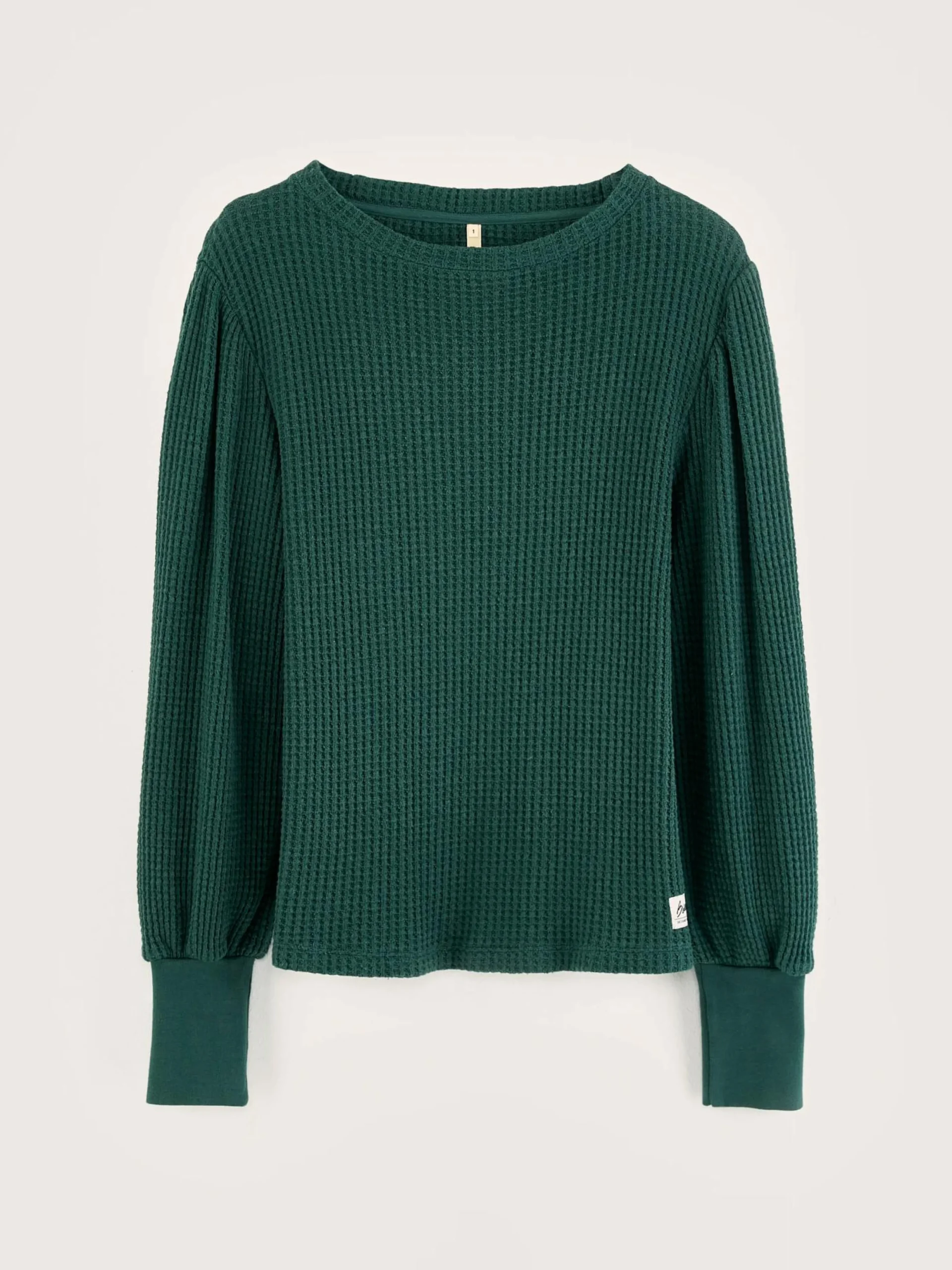 Gewafeld t-shirt met lange pofmouwen, van donkergroen katoen.