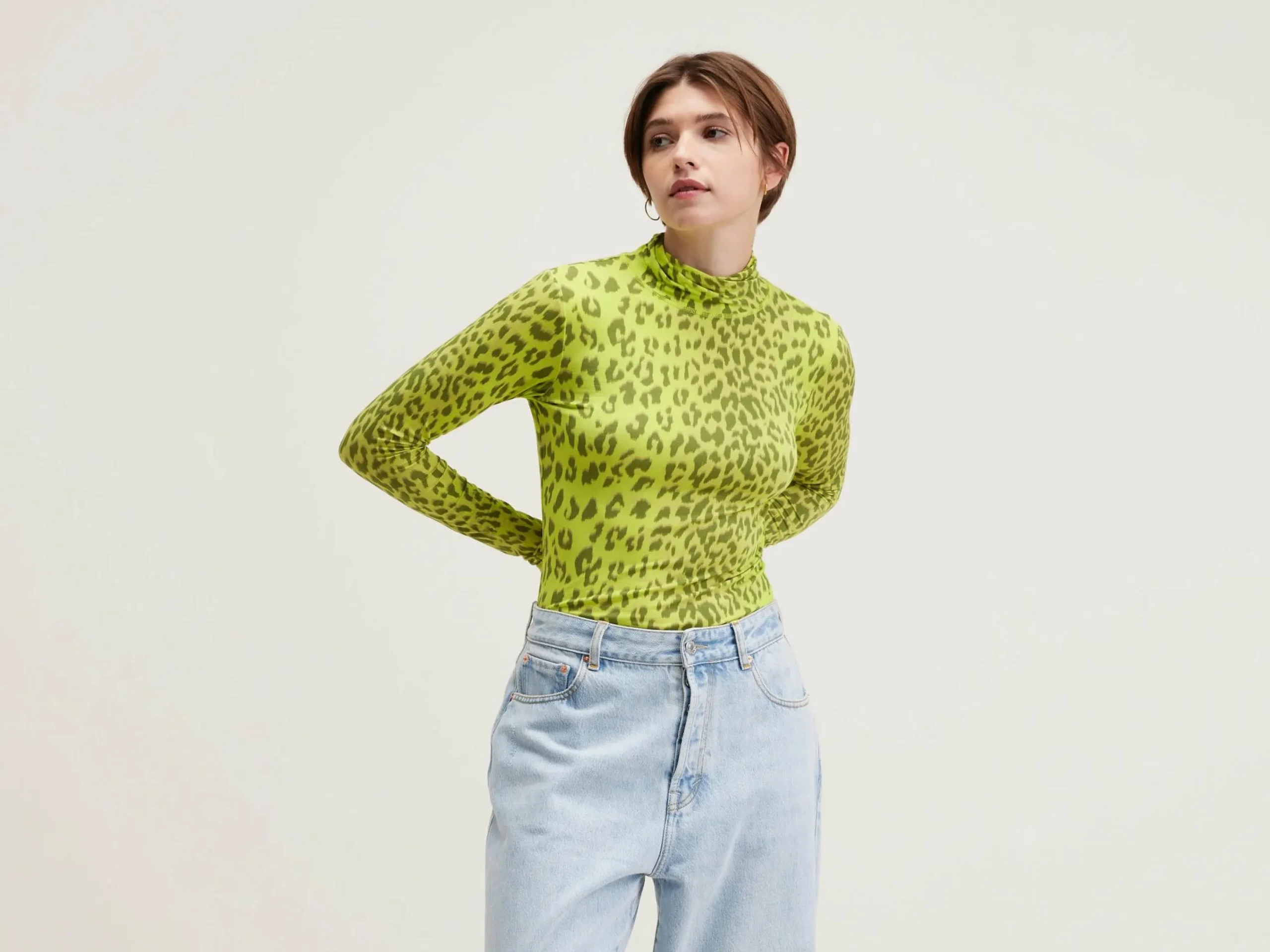Slim fit, flashy geel t-shirt met rolkraag en panterprint, voelt aan als een tweede huid.