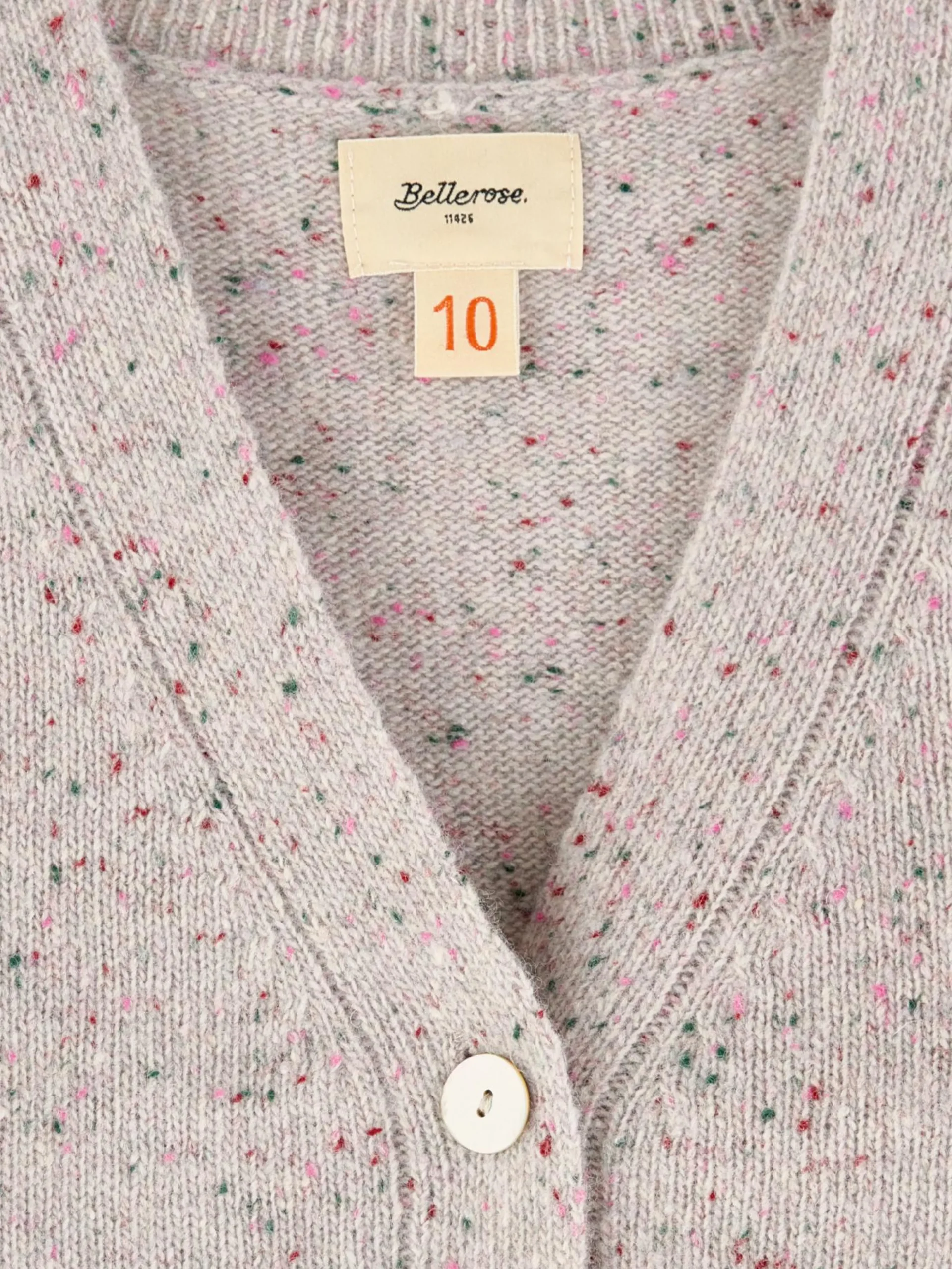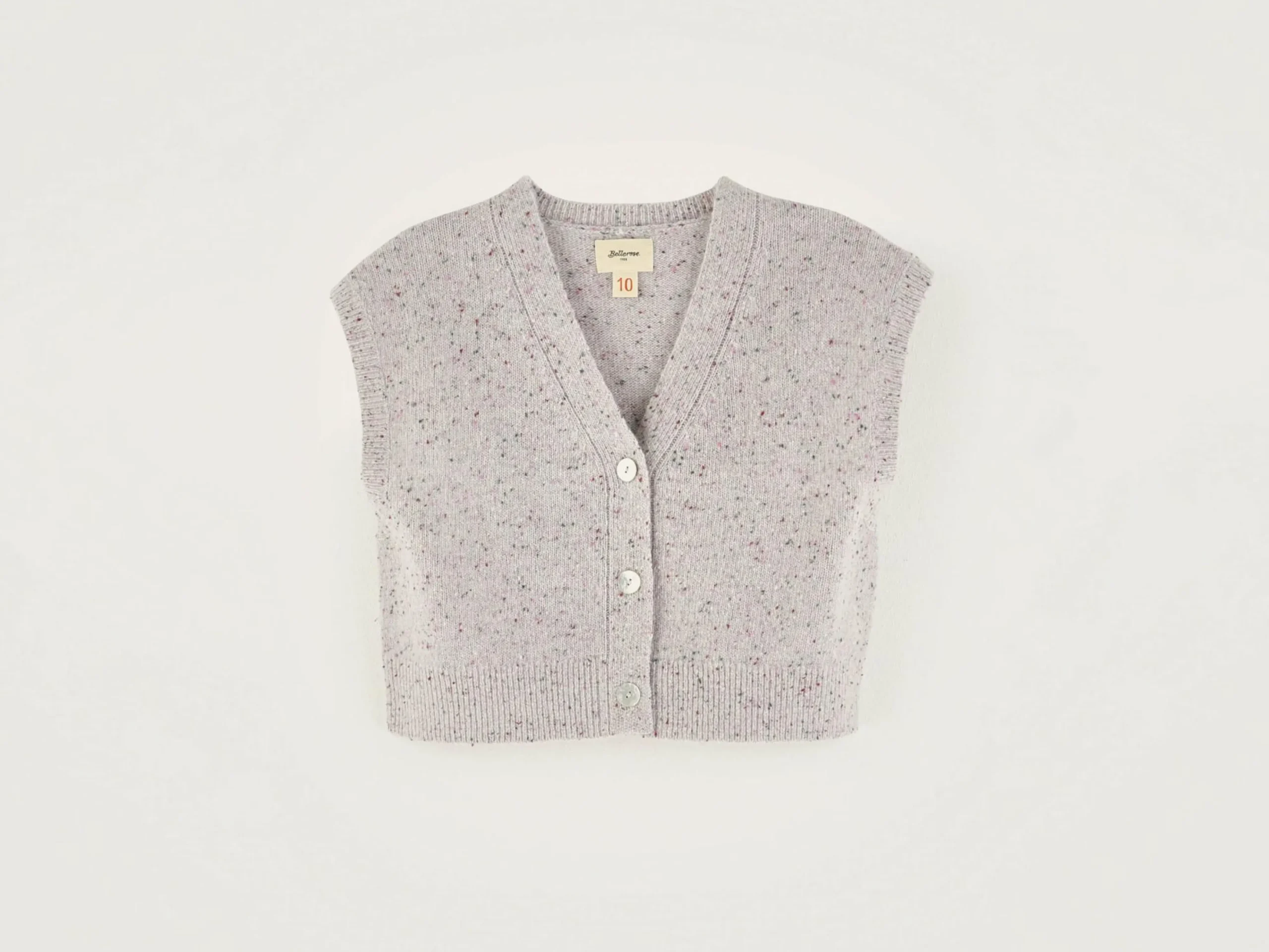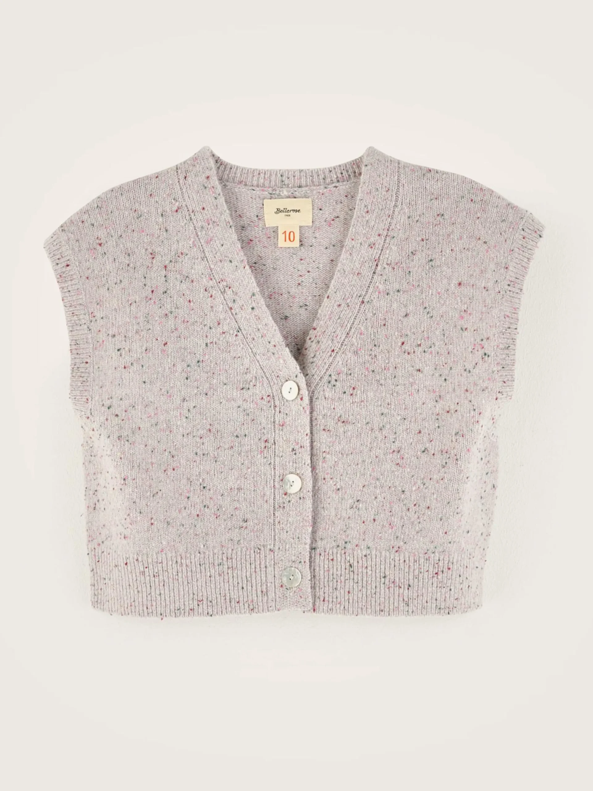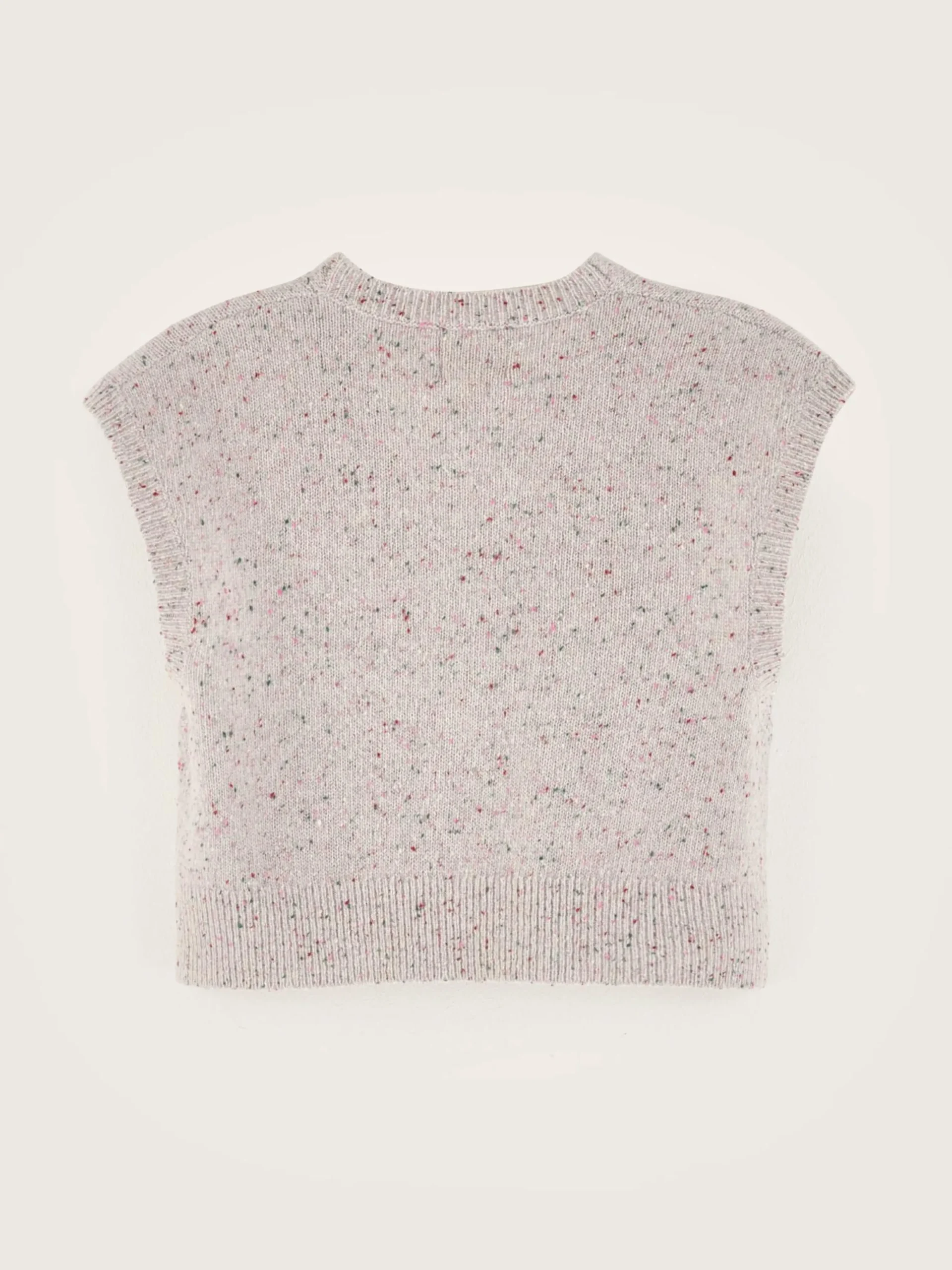 Mouwloos, cropped, gebreid vest met kleurrijke spikkels.
