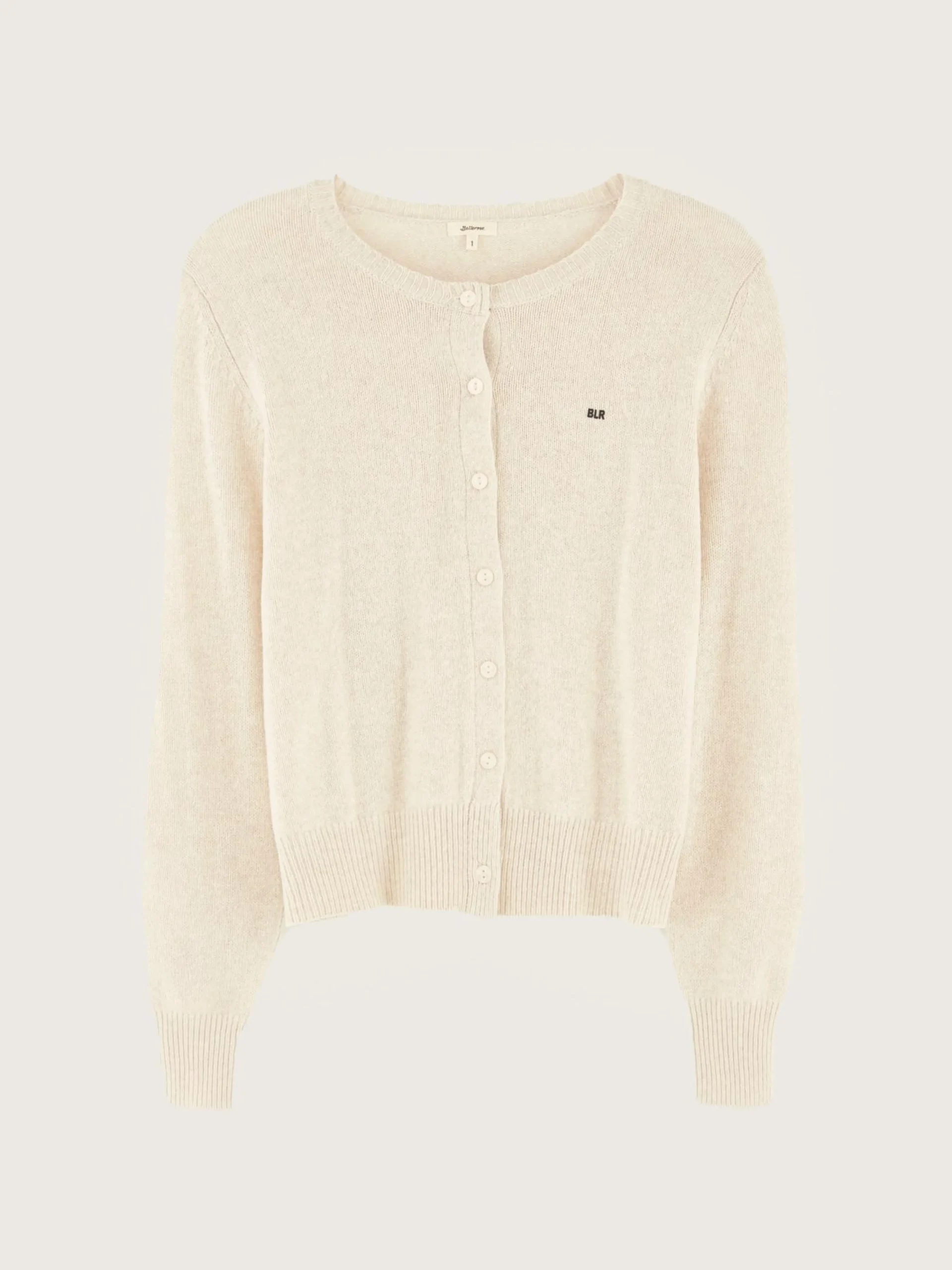 Aansluitende beige gemeleerde cardigan met BLR-logo links op de borst.
