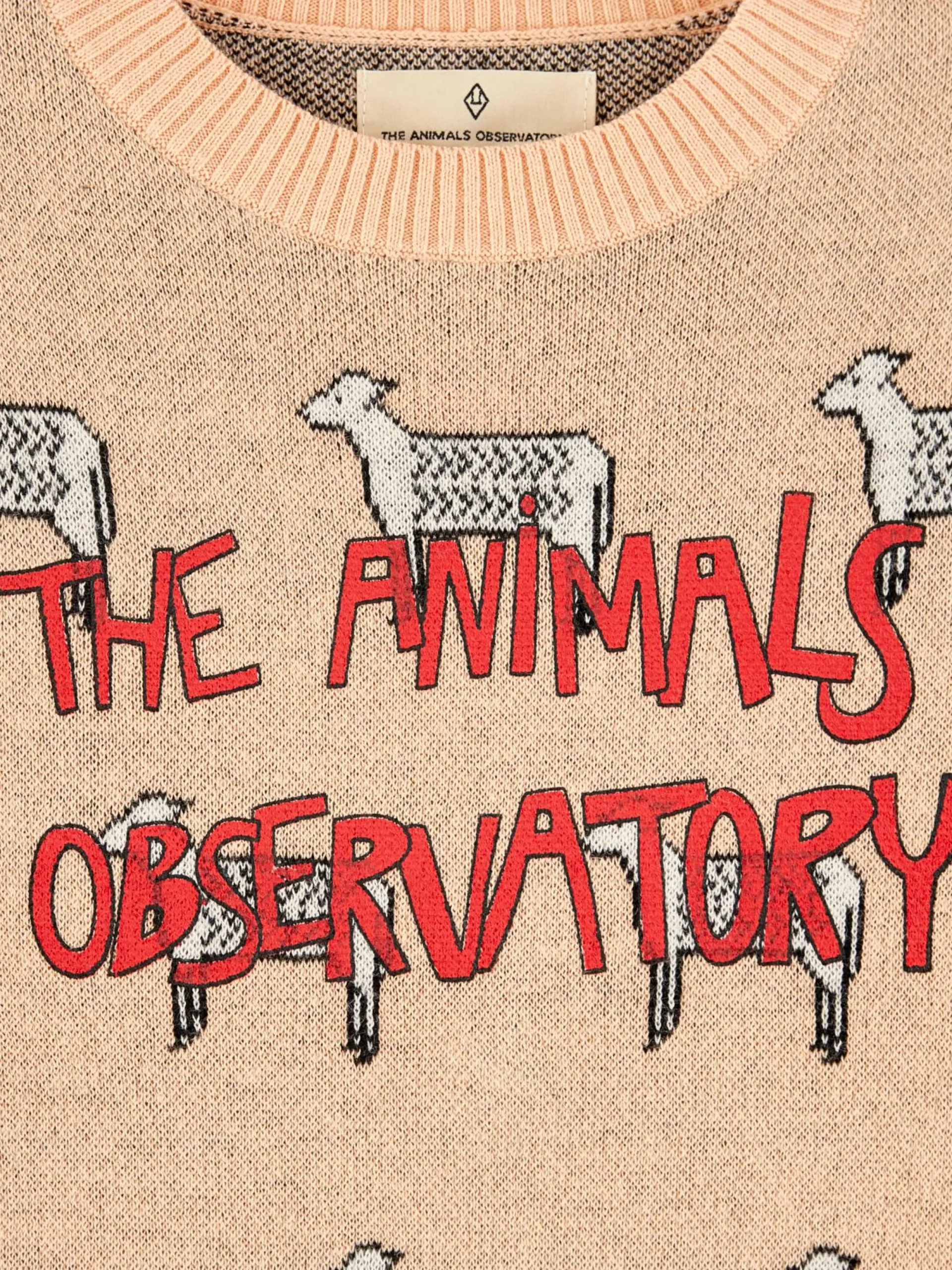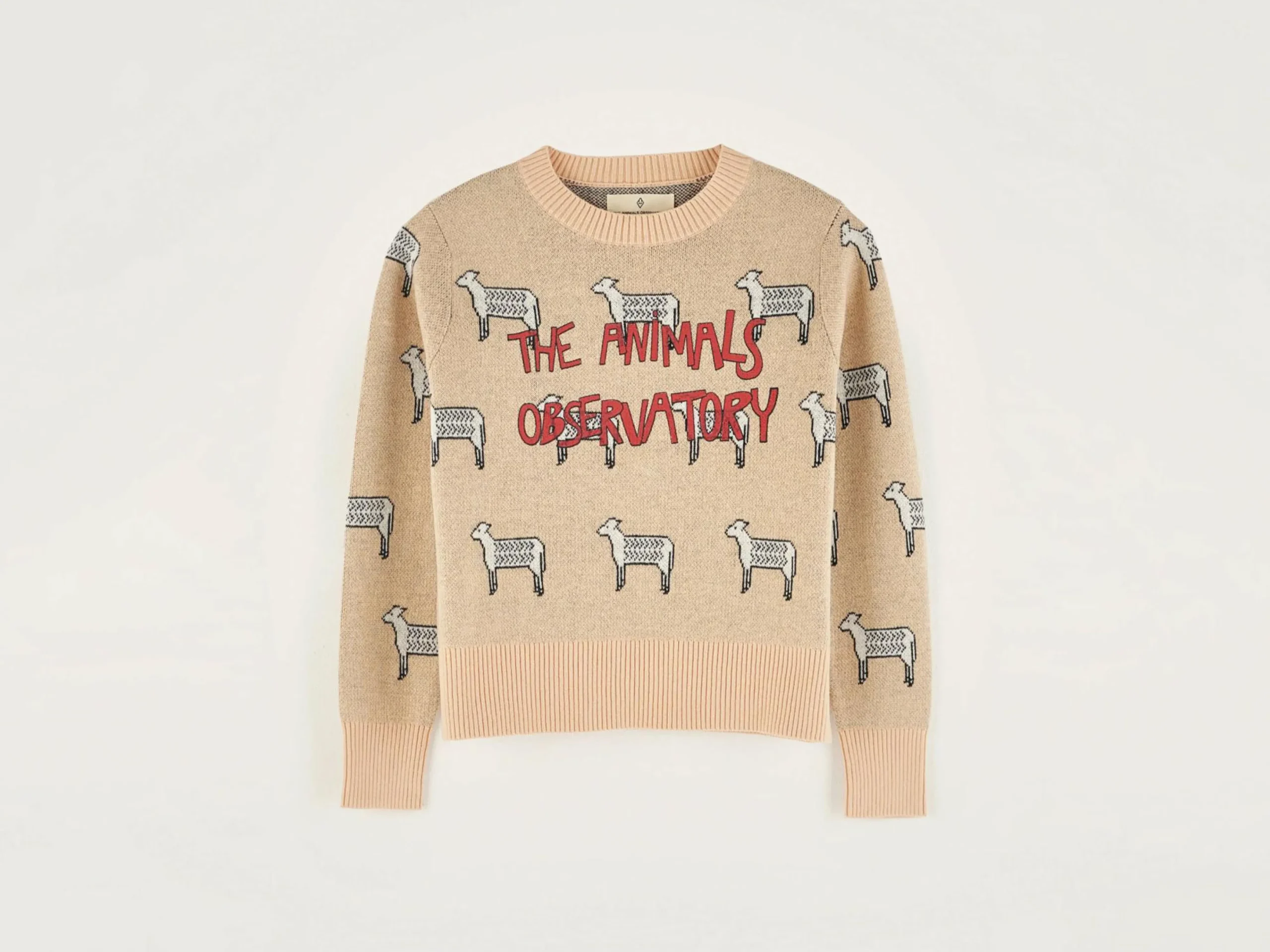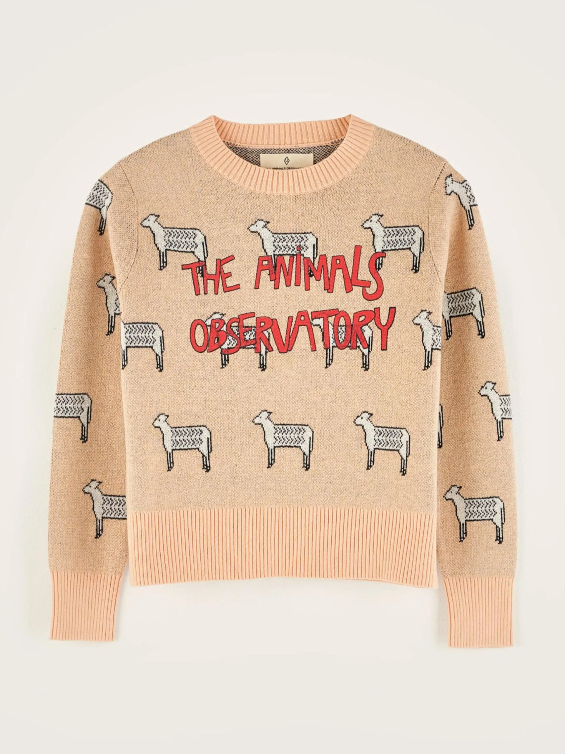 Klassieke jacquard trui met schaapmotief en Bellerose x The Animal Observatory-print op de borst en op de rug.